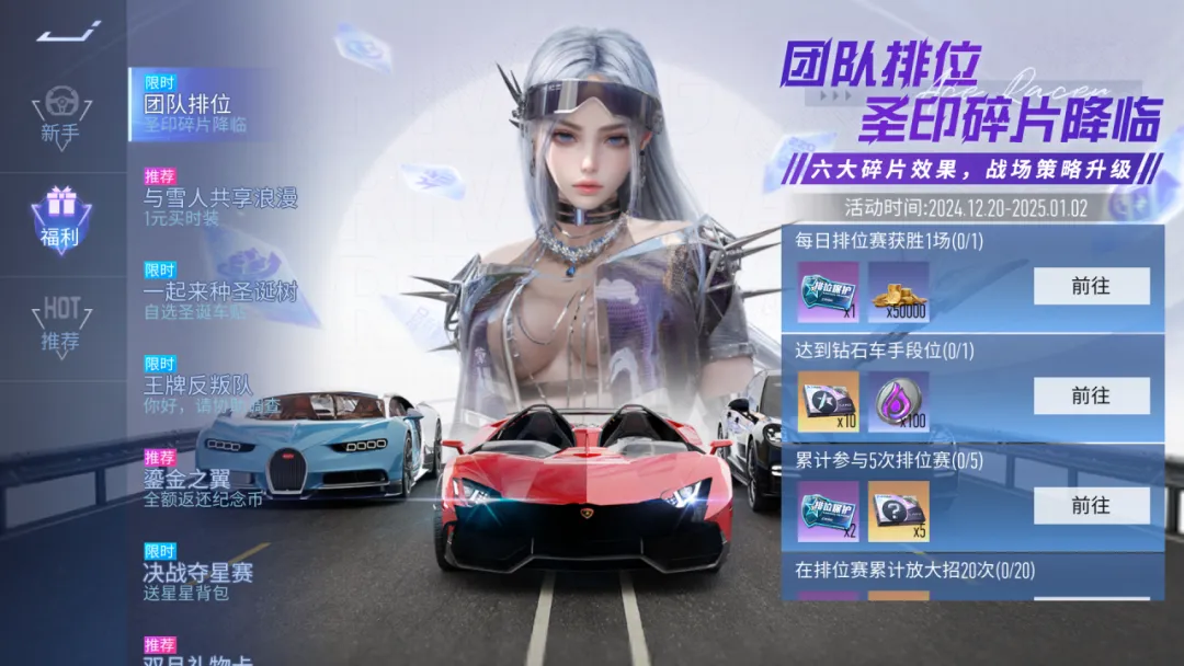 2024年12月20日-2025年1月2日,体验更可免费得排位保护卡、万能零件、零件自选包等奖励!