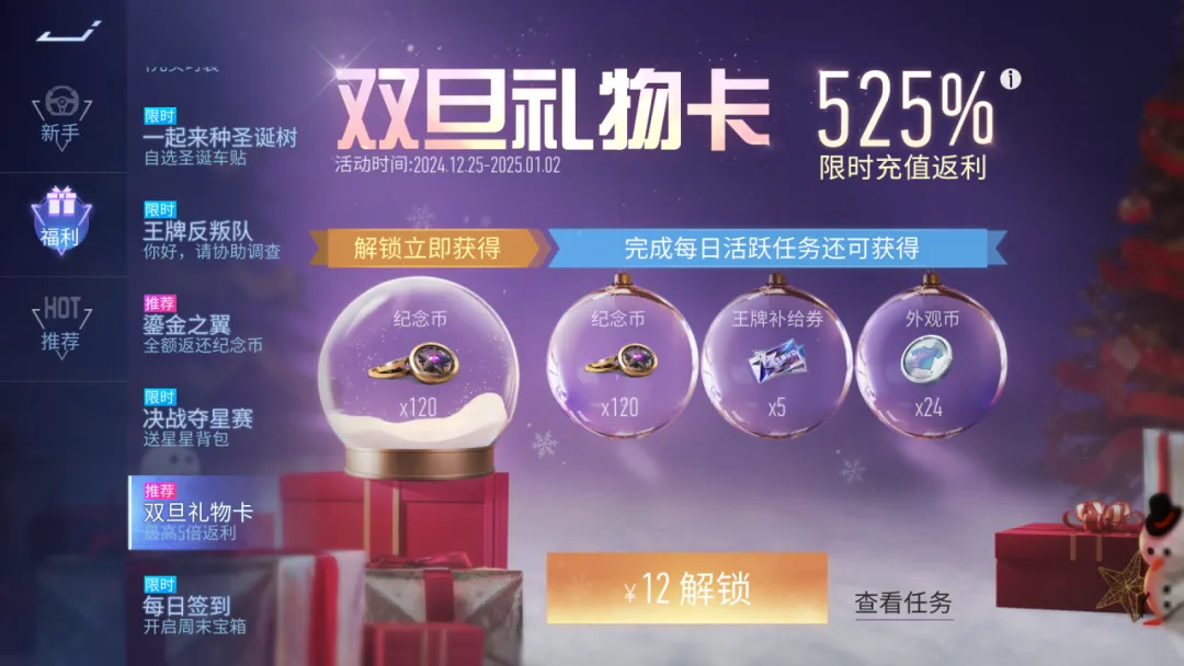 缤纷双旦,好礼不断!2024年12月25日~2025年1月2日,12元即可解锁双旦礼物卡,最高可享受525%返利!解锁后立刻获得120纪念币,连续5天完成任务更可再得120纪念币、5张王牌补给券和24个外观币~