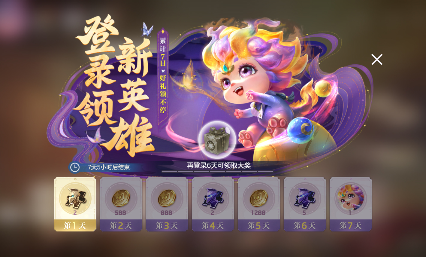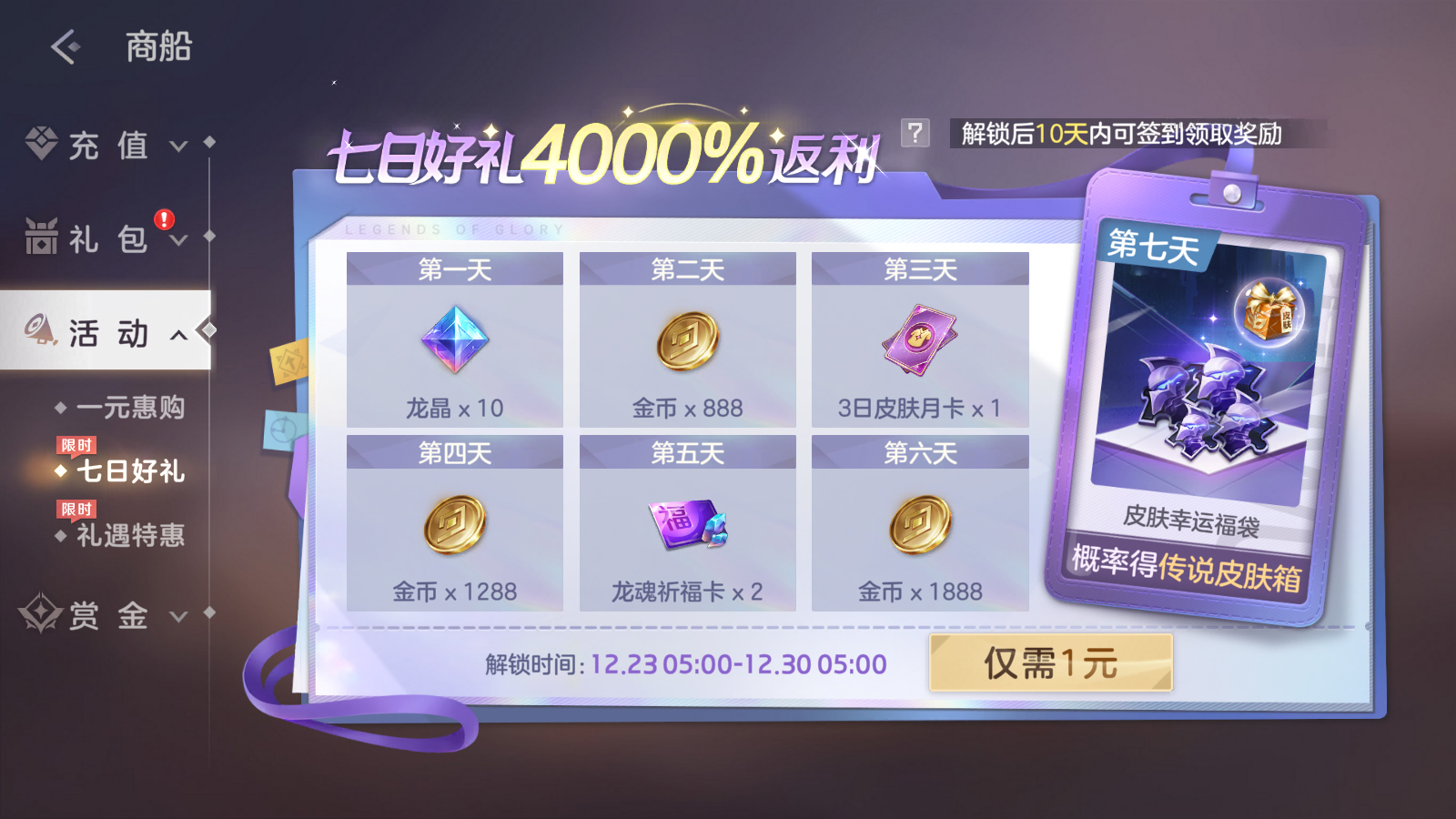 活动期间,付费1元解锁登录活动,登录游戏即可获得龙晶*10、龙魂祈福卡、3日皮肤月卡等奖励。累计登录七天后必定获得皮肤碎片*10,并有概率获得传说皮肤自选箱