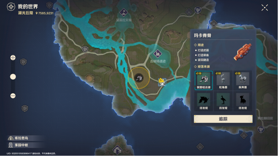 材料的收集也是有追踪功能的,只需要在配方界面点击对应的素材,就可以在大地图自动标记该素材的区域,可利用这项功能更快速的收集到各类需要的材料。