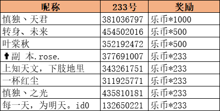 随机抽取5名,送出【乐币*233】;