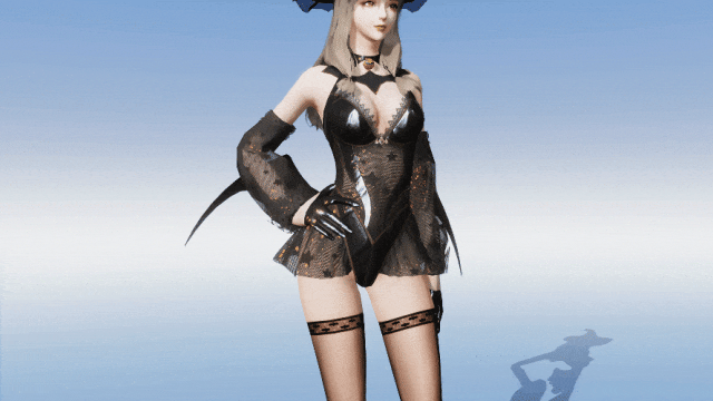 反光皮革贴身剪裁,构成时装的主体部分,黑色细纱点缀在一旁。当时装升至2级时,随着角度的变换,橙黄色亮片时隐时现,完美彰显魔女的极致身材,荒弟有被诱惑到。