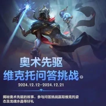 截止至12月21日23:59,召唤师参与问答挑战即可赢取姿态-修械、奥术先驱 维克托英雄体验(3天)和龙魂水晶*500好礼~