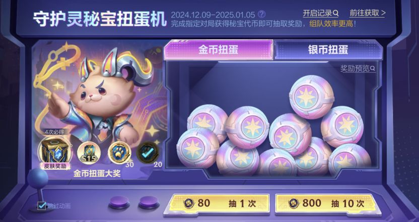 截止至1月5日,召唤师完成指定对局即可获取秘宝金币、秘宝银币;消耗秘宝金币、秘宝银币在守护灵秘宝扭蛋机进行扭蛋,可获得精选分路皮肤宝箱、S15海克斯护盾卡及守护之力等奖励。