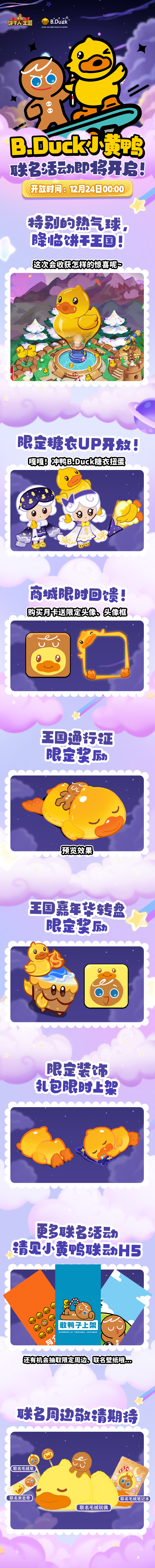 H5活动:B.Duck小黄鸭联动H5也将于12月24日00:00正式开启——当可爱又颇具个性的小黄鸭与饼干相遇,会交织出怎样的酥脆反应呢?请尽情探索,收获特别的壁纸吧!