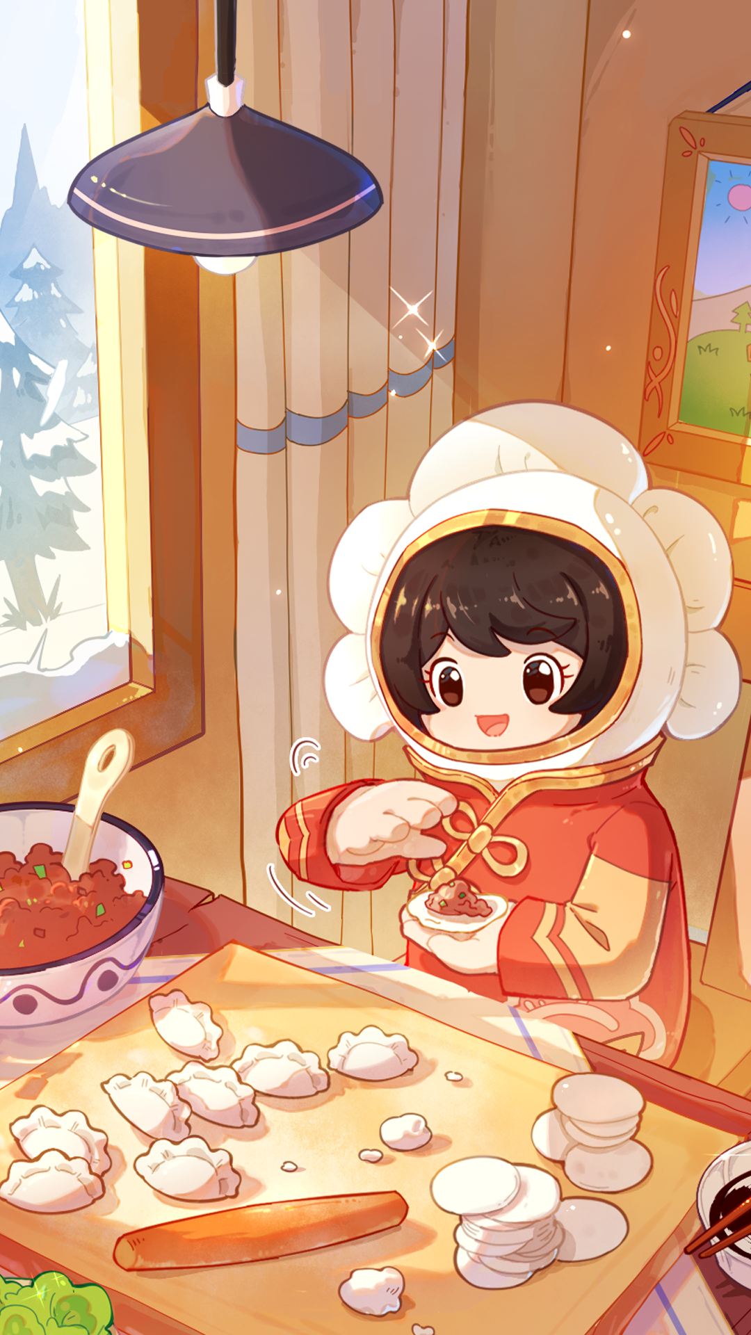 时至晌午,暖阳正好;好好鸭正在推动擀面杖擀出一个个薄薄的皮,饺饺将小红狐家农作物做出的馅料的填在饺子皮里,捏出一个个圆滚滚的饺子,配合天衣无缝,而紫萝萝呢,好好鸭放下擀面杖寻找...