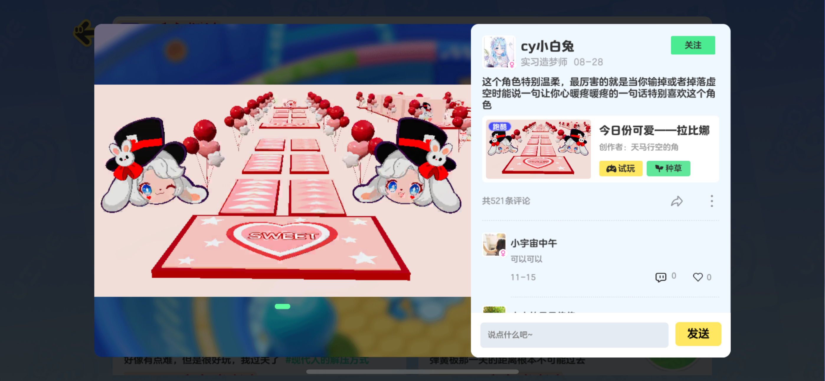 “元梦之星一周年快乐哇!很感谢元梦种草社区这个平台,让我从一个小小星宝成长为一位地图种草官,这一年来认识了很多有趣的星搭子,收获了许多可爱的粉丝星宝们,感受到了大家满满的爱哇!天气晴朗,万物可爱~希望每一个星宝天天开心!同时也祝元梦之星越来越好,我们未完待续~”