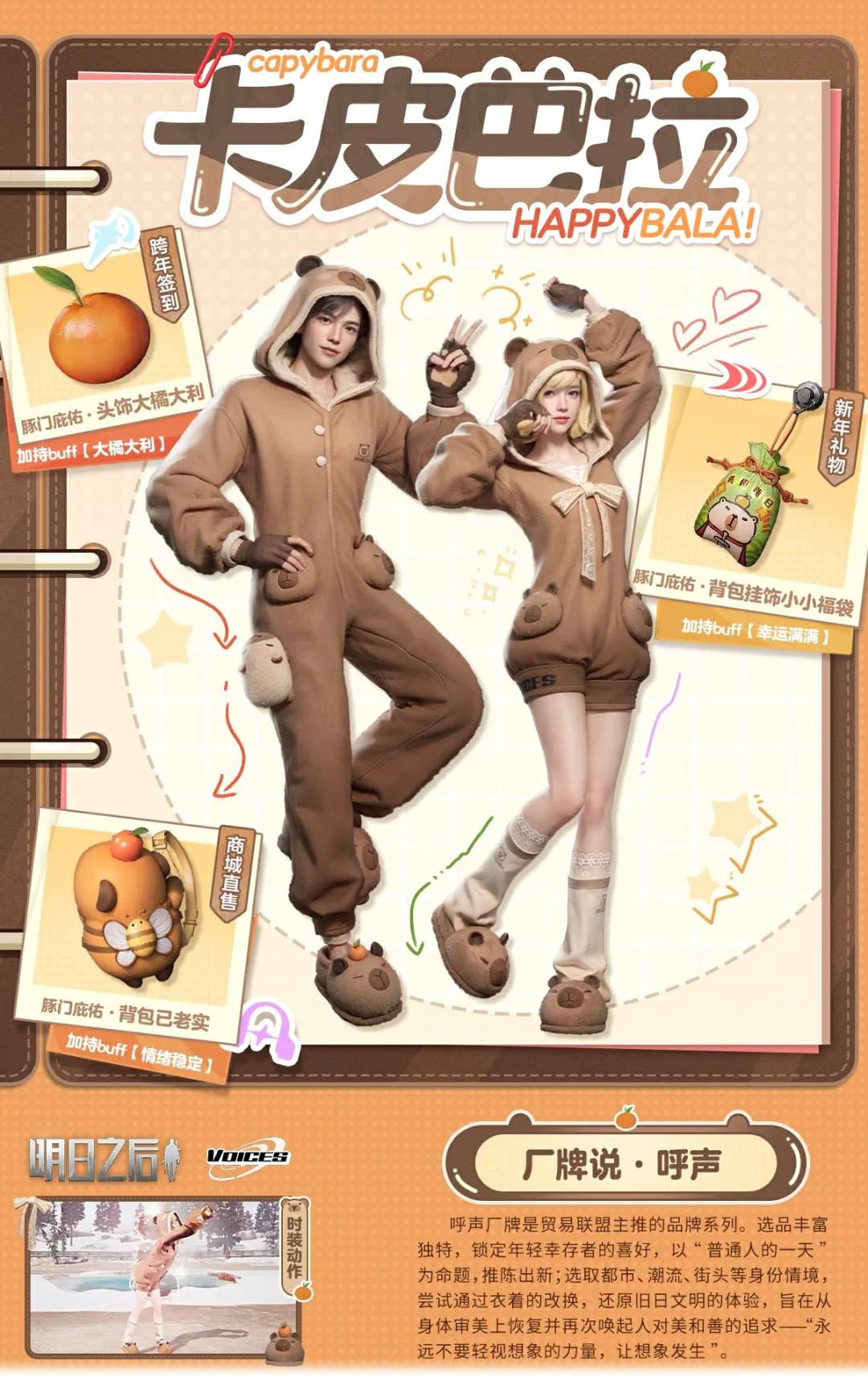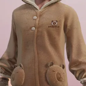 衣服正面用简约的扣子点缀,颜色与整体暖棕色调呼应,同时胸前的水豚标志刺绣可可爱爱,就像是一个属于“水豚俱乐部”的专属徽章。