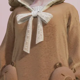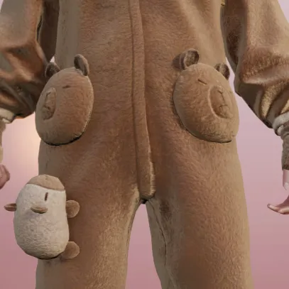 胸前点缀了一条带有蕾丝花边的蝴蝶结,为这件卡皮巴拉风的时装增添了一点温柔的“水波纹”。轻盈的蕾丝让整体风格不仅仅是萌,还有一丝优雅,仿佛在慢悠悠的小溪边,水豚正懒洋洋地享受阳光;