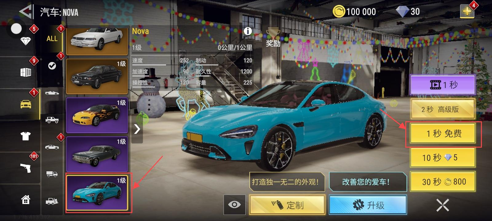 第三步:点击车库,找到小米su7(或其他车辆),点击交付,然后再点击 “1秒免费”