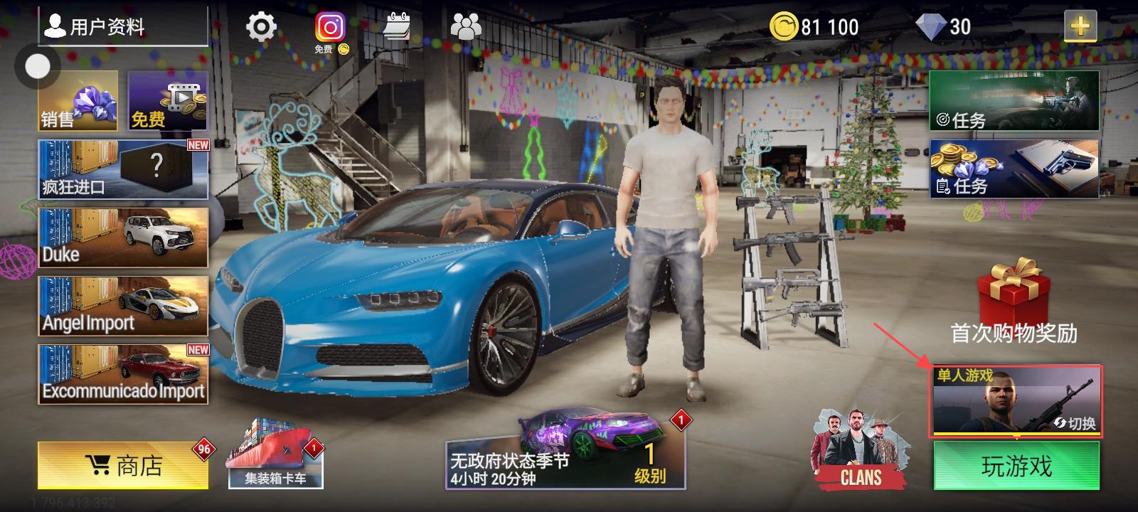 第二步:在大厅中选择单人模式(解锁车辆只在单人模式中生效!)