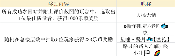 ps:最佳质量奖和盖楼幸运奖每位玩家只可获得其中一份,优先选取最佳质量奖玩家,如获奖玩家后续获得盖楼幸运奖则该奖励顺延至下一个楼层的玩家。