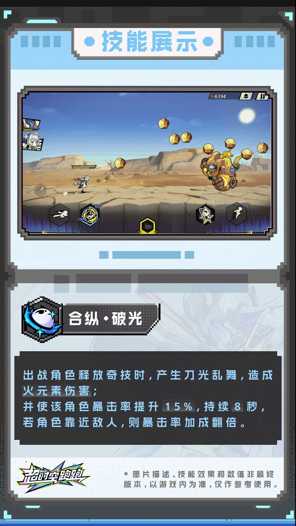 代号柒的【合纵·破光】会使出战角色释放奇技时,产生刀光乱舞,造成【火元素伤害】;并使该角色暴击率提升,持续数秒,若角色靠近敌人,则暴击率加成翻倍。