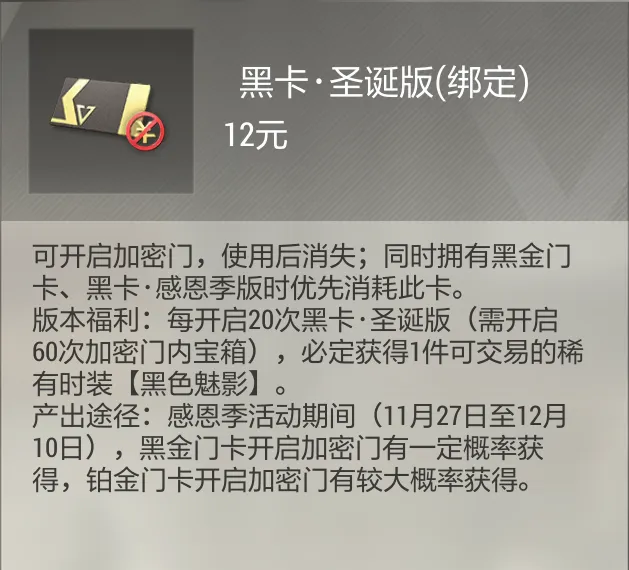 【黑卡·圣诞版】可开启加密门,使用此版本黑卡可额外概率获得可交易的稀有时装【黑色魅影】;