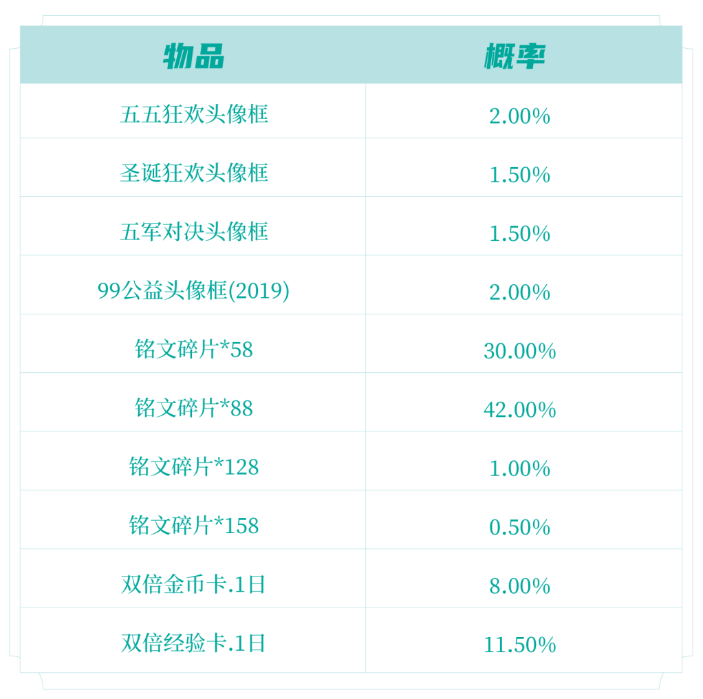 打开后可随机获得以下奖励之一:五五狂欢头像框、圣诞狂欢头像框、五军对决头像框、99公益头像框(2019)、双倍金币卡:1日、双倍经验卡:1日、铭文碎片x158/128/88/58。