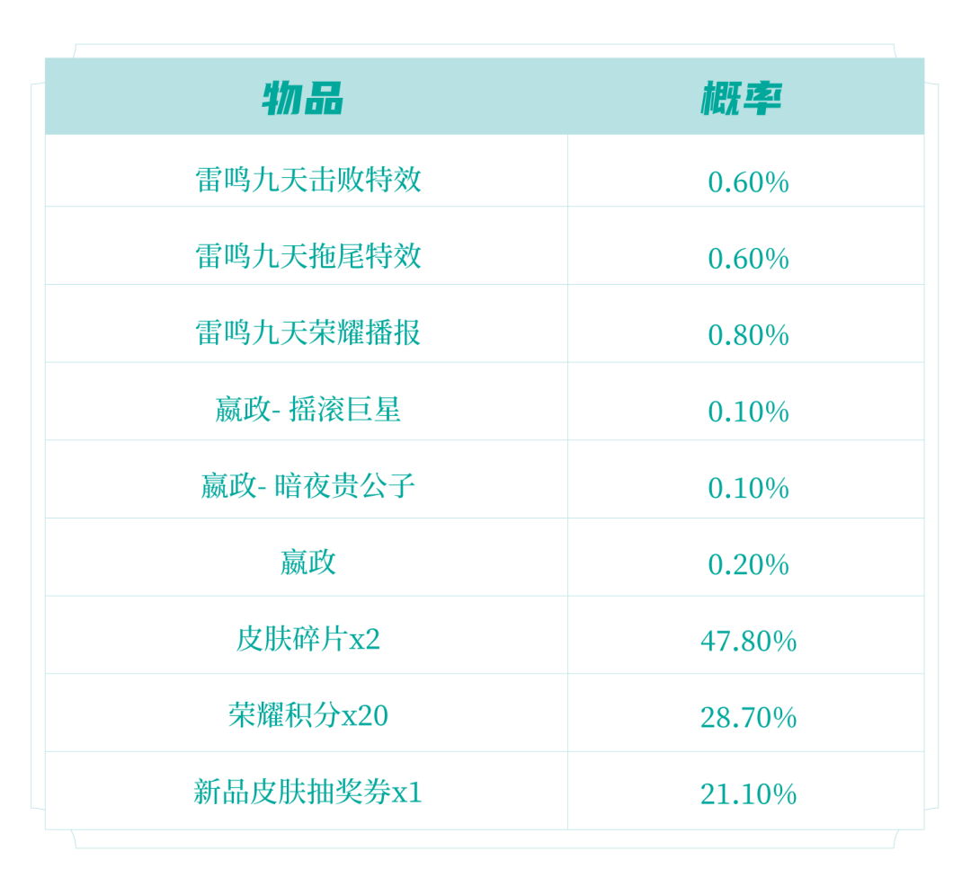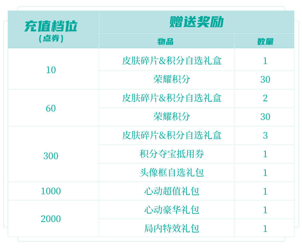 ◈皮肤碎片&积分自选礼盒:打开礼包可任意选择以下奖励之一:荣耀积分*10或皮肤碎片*1