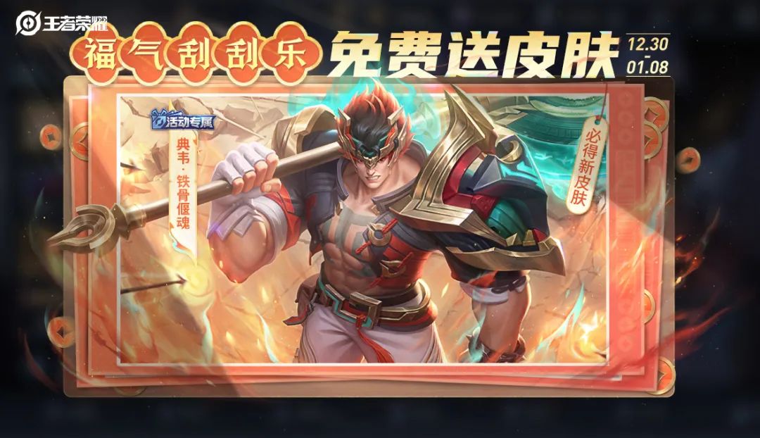 ◈活动规则:参与活动刮开刮刮卡, 可兑换全新活动专属皮肤:典韦-铁骨偃魂、迎新福袋等奖励(打开后随机获得以下奖励其一:遗忘之水(赛季)、改名卡、排位加星卡、排位保护卡、春江跃鲤、限时语音)