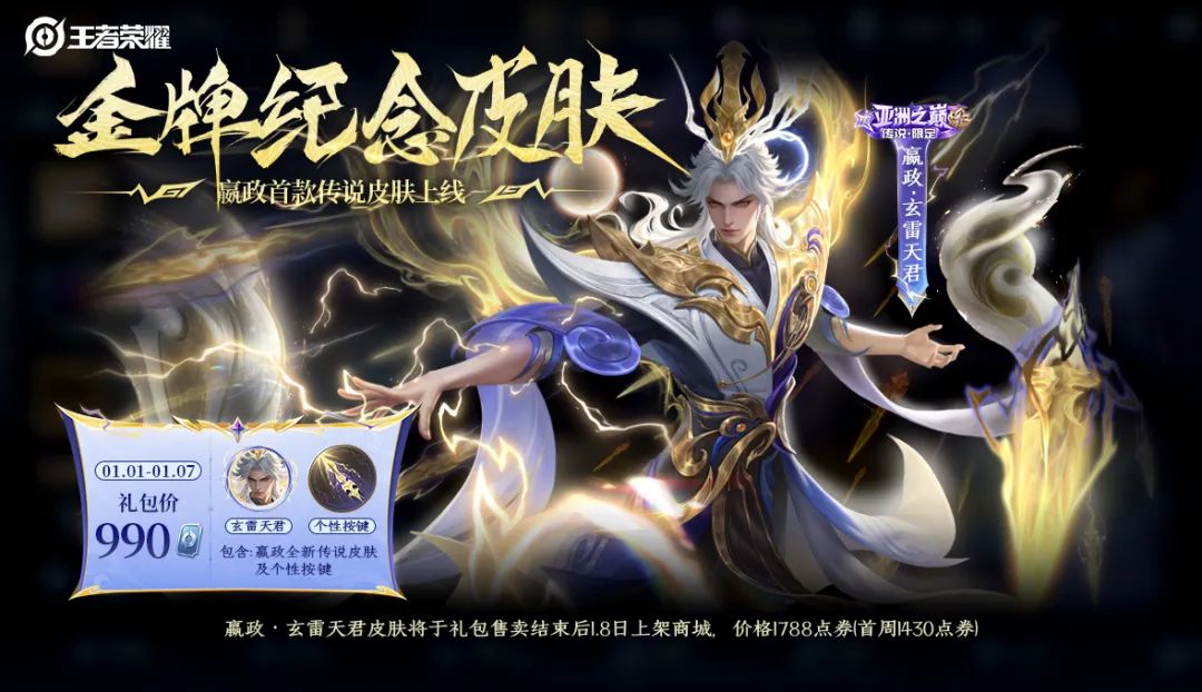 出自东方,冠绝亚洲,是王者也是金牌!为纪念杭州亚运会电子竞技项目首金荣耀,作为亚洲之巅金牌纪念皮肤的嬴政-玄雷天君,正式登场!