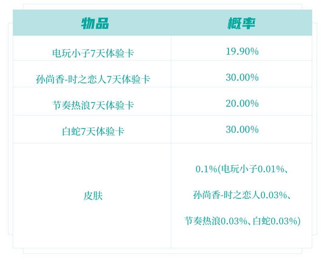 打开后必得皮肤碎片x2、铭文碎片x100和以下随机奖励之一:皮肤或皮肤体验卡(7日)1张(鲁班七号-电玩小子、孙尚香-时之恋人、阿轲-节奏热浪、大乔-白蛇)