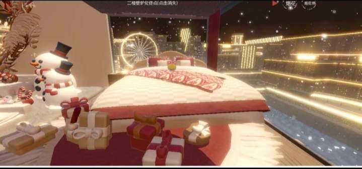 天呐!竟然有一张这么柔软的大床!床的旁边竟然是雪人!快看他的床尾竟然也有礼物!看,我们又看见了那座摩天轮!窗外还有这么多高楼大厦呢!而且还亮着灯呢!那让我带你们去看看休息室吧!
