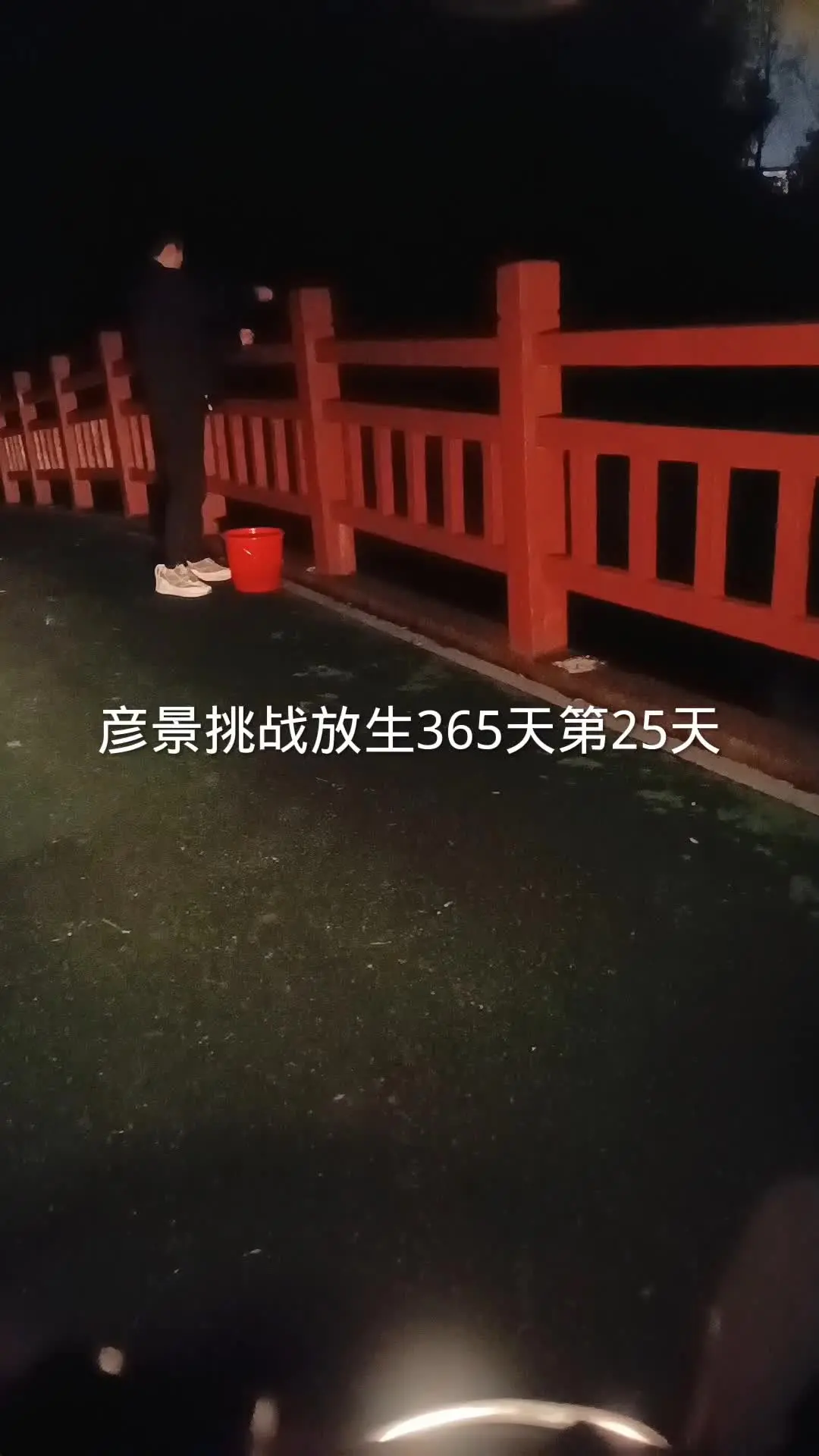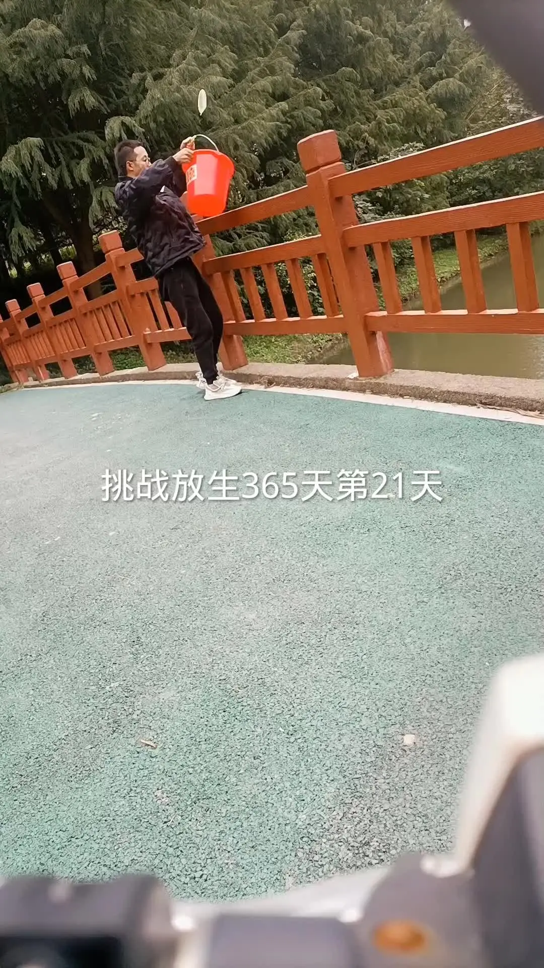 彦景进行挑战行善放生365天的第55天,带着装有生物的橙色桶到水边完成放生,祈愿好运、获得金山银山。