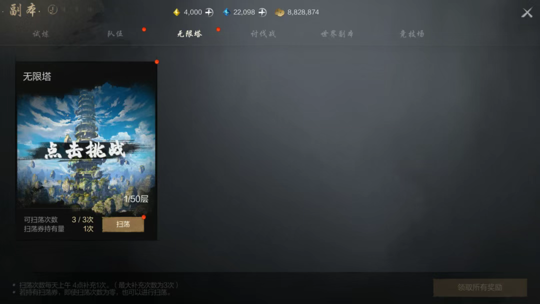 无限塔每天都会恢复一次扫荡次数,所以需要在实力变强后,才可能爬更高层的塔,这样消耗扫荡次数时,就能最大限度获得奖励。