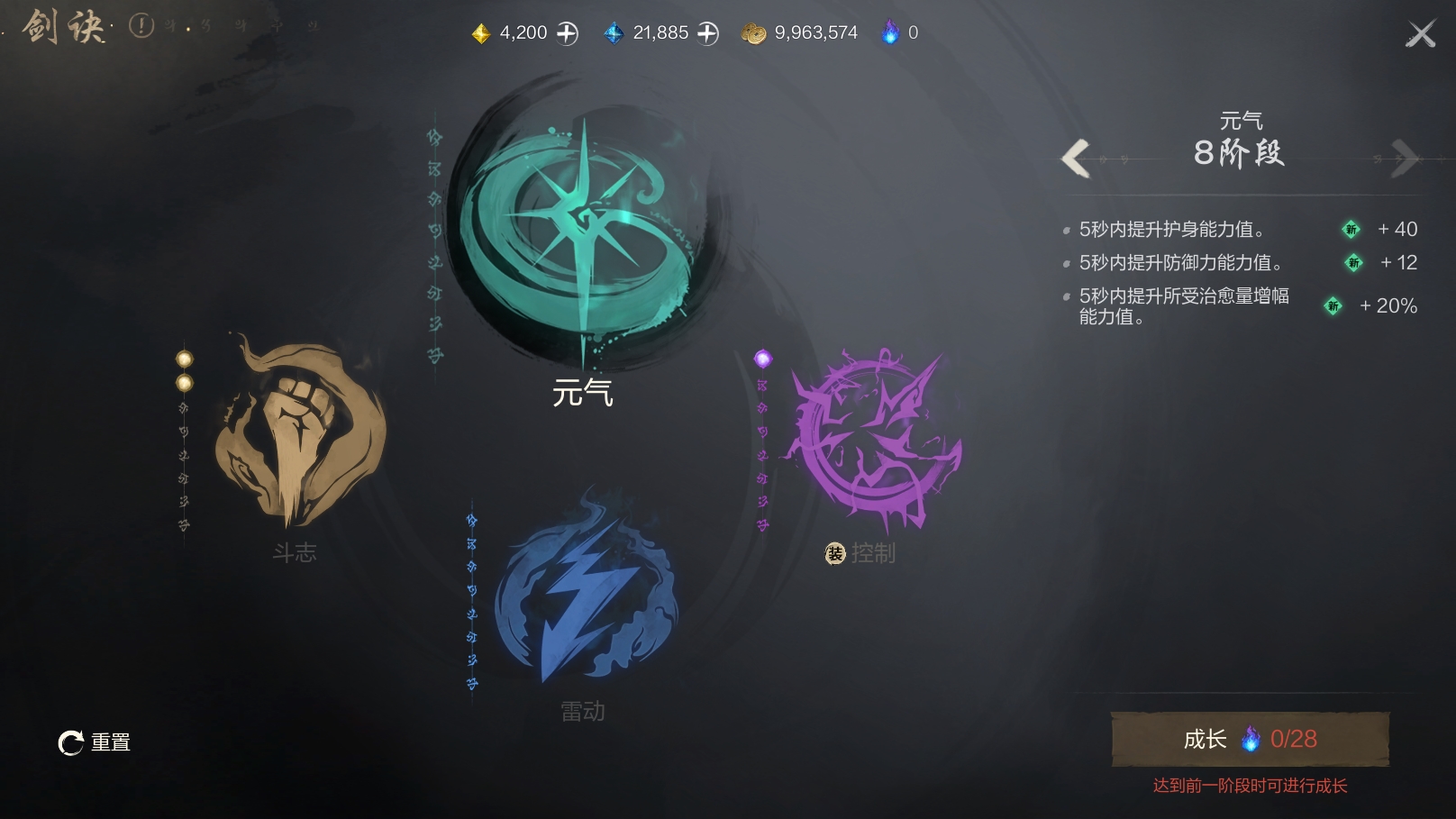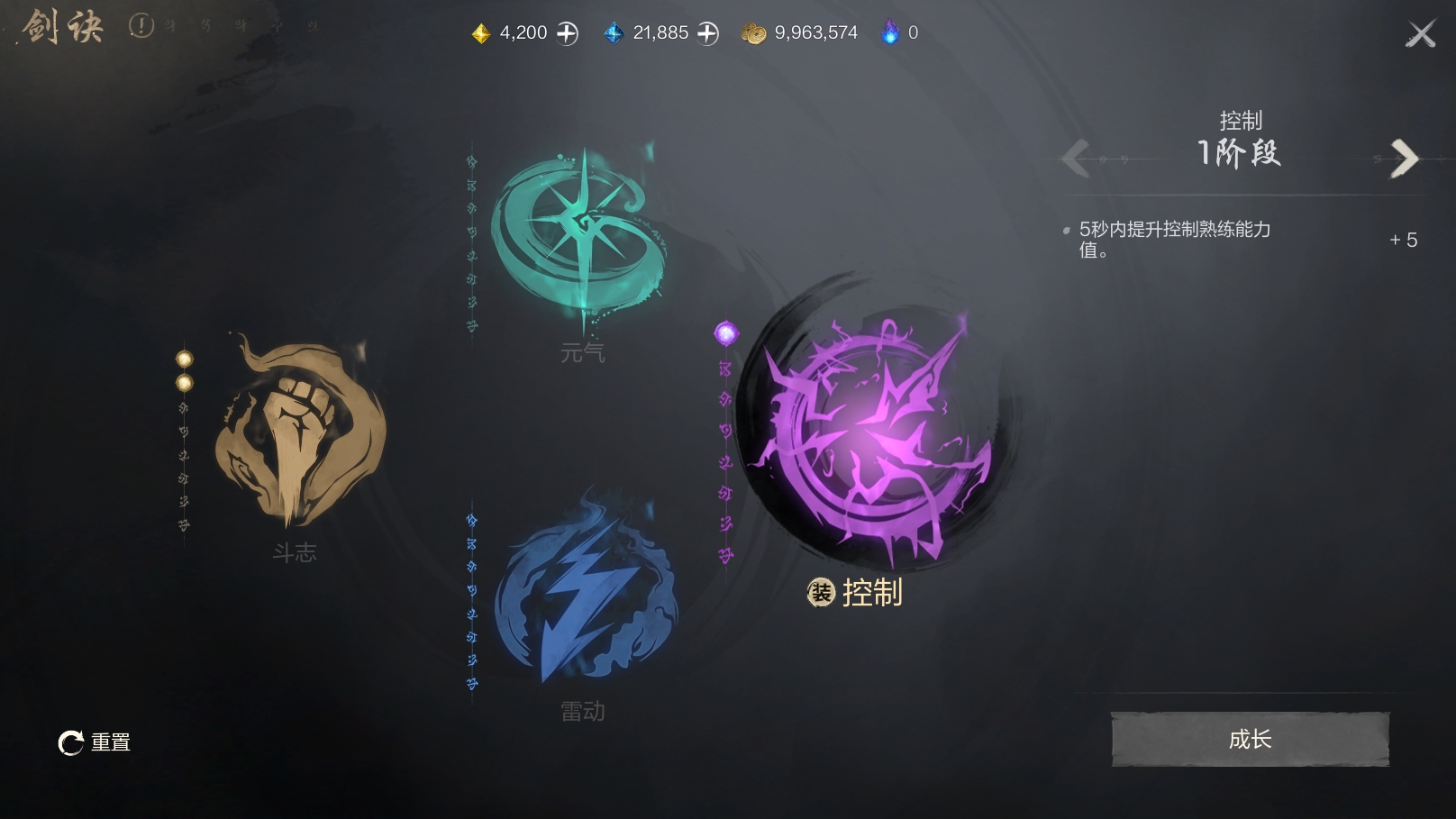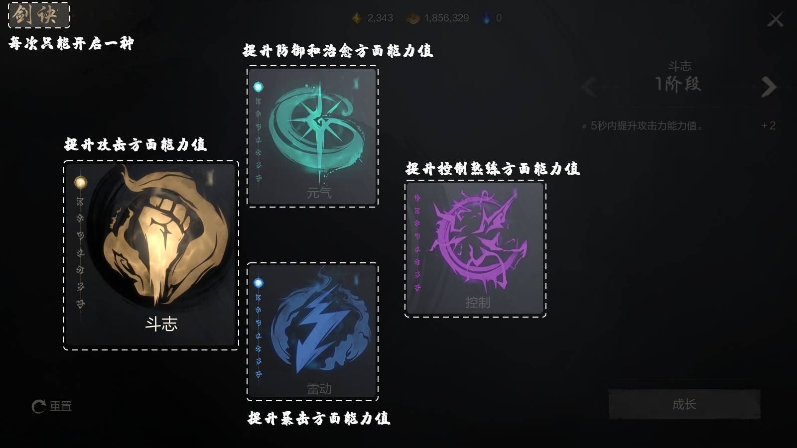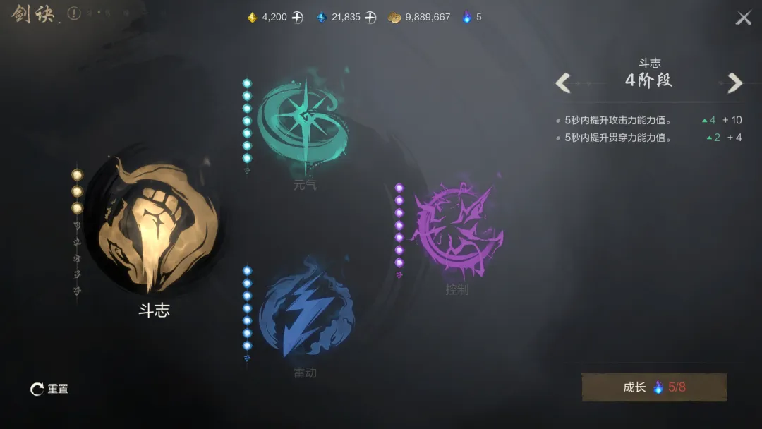 其中,剑诀总共可分为4种,包括斗志、元气、控制和雷动,且每次只能开启其中一种。