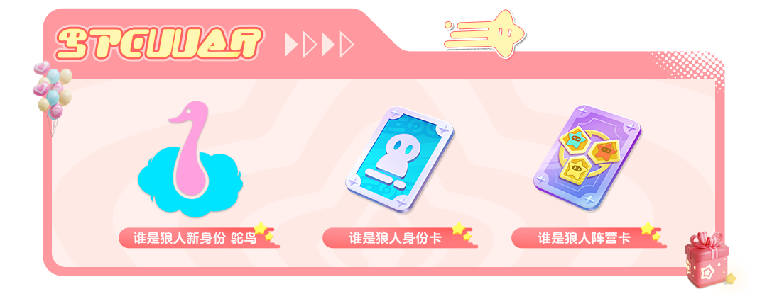 2024年12月27日-2025年1月9日,游玩谁是狼人,累积对局数,可获取谁是狼人新身份 鸵鸟,还有谁是狼人身份卡、阵营卡,互动道具 新年快乐*1等奖励
