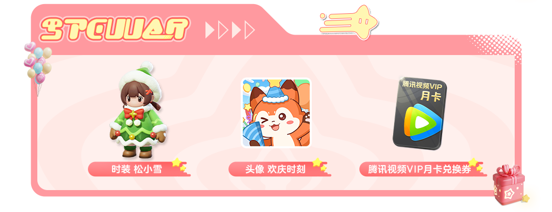 2024年12月27日-2025年1月12日,完成对应活动任务可累积摇树券,利用摇树券参与摇树,或通过累积兑换物小糖心兑换奖品,获得时装 松小雪、头像 欢庆时刻,腾讯视频VIP月卡兑换券等奖励。