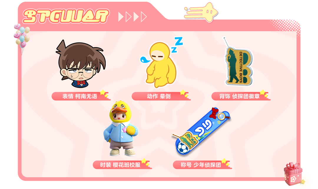 2024年12月27日-2025年1月5日,寻找好友加入少年侦探团,与搭子们一起完成侦查团任务,可获得表情 柯南无语、动作 晕倒、时装 樱花班校服、背饰 侦探团徽章、称号 少年侦探团等奖励。