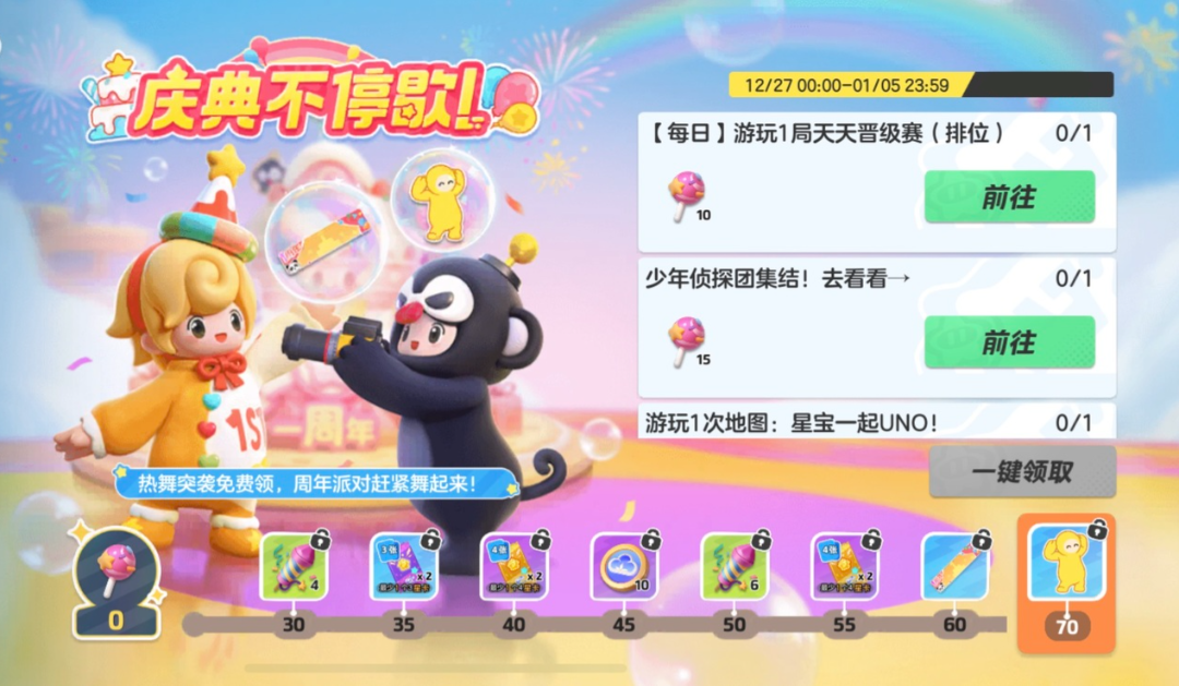 2024年12月27日-2025年1月5日,庆典不停歇,超多福利免费领,完成对应活动任务,累积兑换物,可兑换动作 热舞突袭、昵称框 一岁一礼等奖励。