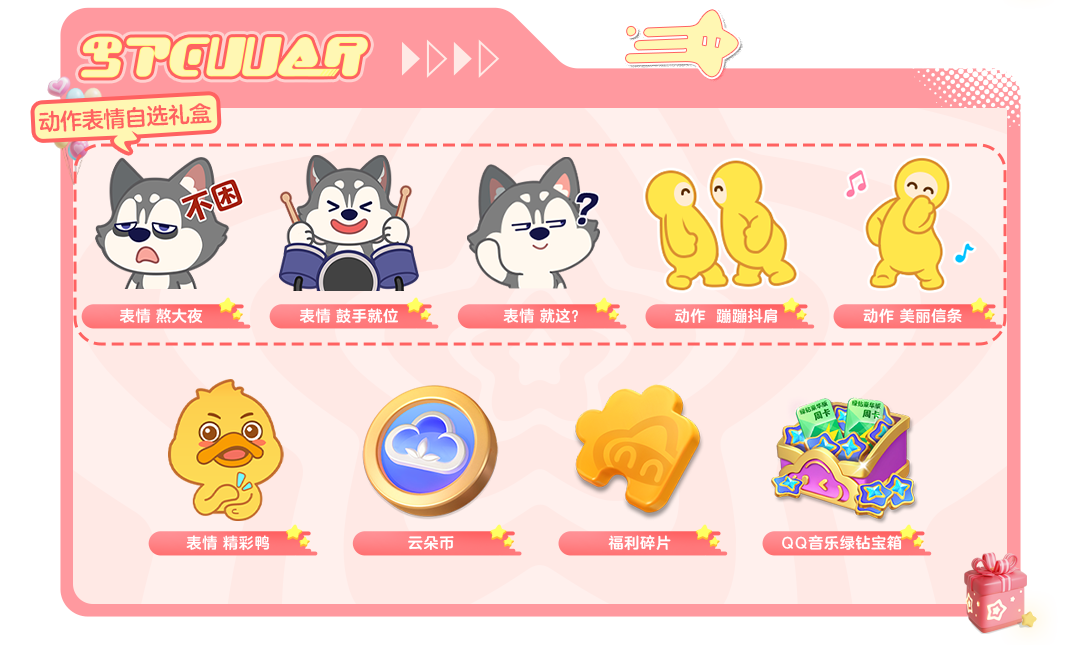 12月27日—12月31日,许愿五选二活动限时开启,星宝在27日和28日登录每日可在以下奖励中任选一个许愿:QQ音乐绿钻宝箱、表情 精彩鸭、云朵币*20、福利碎片*15、动作表情自选礼盒(五选一):表情 就这?、表情 鼓手就位、表情 熬大夜、动作 蹦蹦抖肩、动作 美丽信条。