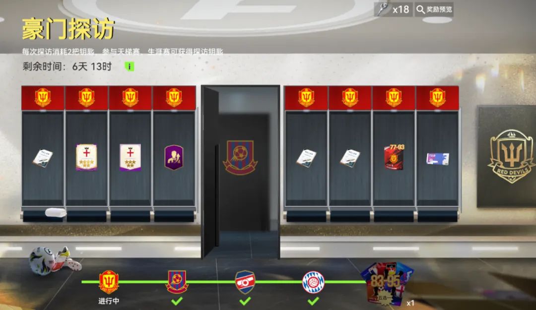 活动期间,参与生涯赛、天梯赛对战获得探访钥匙,消耗探访钥匙可打开更衣室柜子,每个柜内均有奖励,如在柜子中找到球会钥匙,即可前往下一间,当在最后一间更衣室找到球会钥匙后可获得最终大奖。