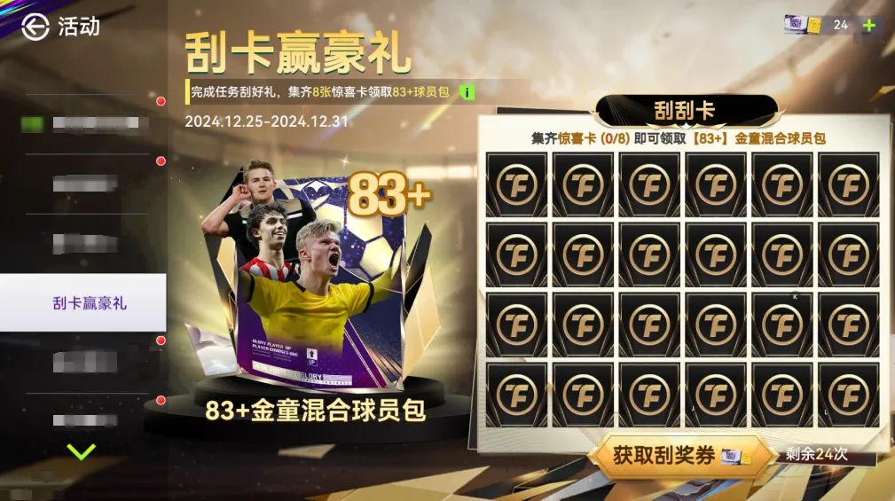 完成任务刮好礼,集齐8张惊喜卡领取【83+】金童混合球员包。