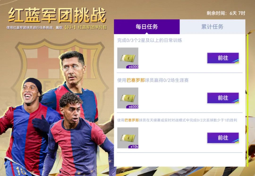 使用红蓝军团球员进行任务挑战,赢取【83+】巴塞罗那球员包。