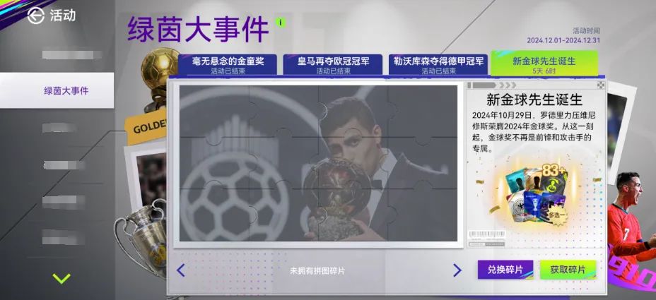 1、每一期活动对应4个发生在绿茵场上的大事件,每个时间需要集齐12个不同的碎片用以激活事件;
