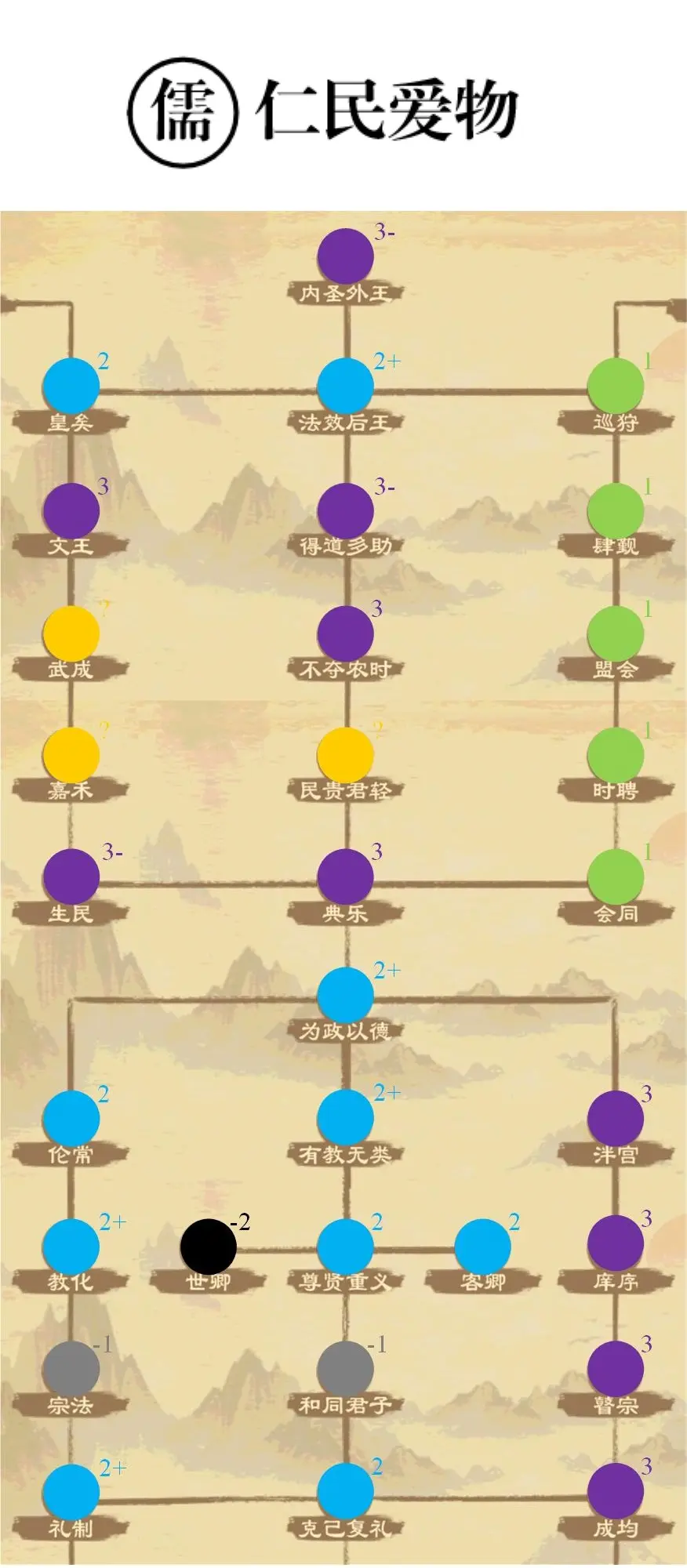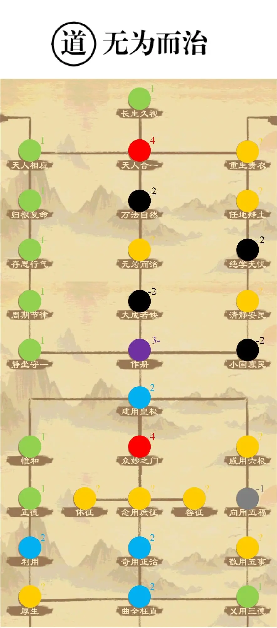 道家主修生民,生育和种田政策都有一些,总体比较杂。很有特色的流派,追求转化与平衡,大量政策正负面效果都很突出,神政策与神坑政策并存,需要依具体局势选择施政。