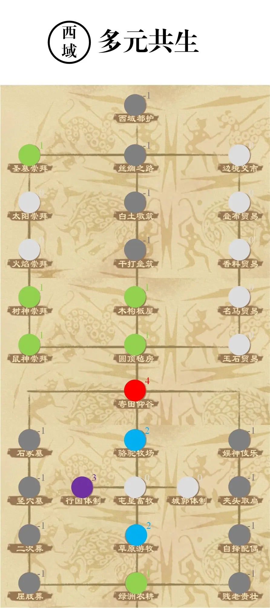 寄田仰谷:全蛮族政策中唯一给出的4级政策。原意是西域部分国家不适宜耕种,借用周边国家土地进行耕种并开展谷物贸易。游戏中的具体算法是:城邑粮产加成=周边全部城邑农田数/10*1%,需要注意的是,不仅算邻国的城,自己的城也算!举个例子而言,按平均每城与三座城相邻,农田数100计算(前中期不难达到,好点的人才开荒也有),全国粮产加成就能达到30%,效果相当于中夏最强粮产政策的草本经;中后期平均有300田的阶段,粮产基本上就翻倍了。理解起来就是每个城都被周边所有城“借田种地”,而对本地生产又不造成影响,可谓是虚空造粮,是不是应该叫“寄田养蛊”?比较可惜的是目前族域包政策只能在争霸模式中使用,开局单城且周边都是荒地情况下此政策是无法发挥作用的,需要发展一段时间收益才能上去。等未来开放常规模式下能够选择蛮族,此政策开局的收益也会相当可观。
