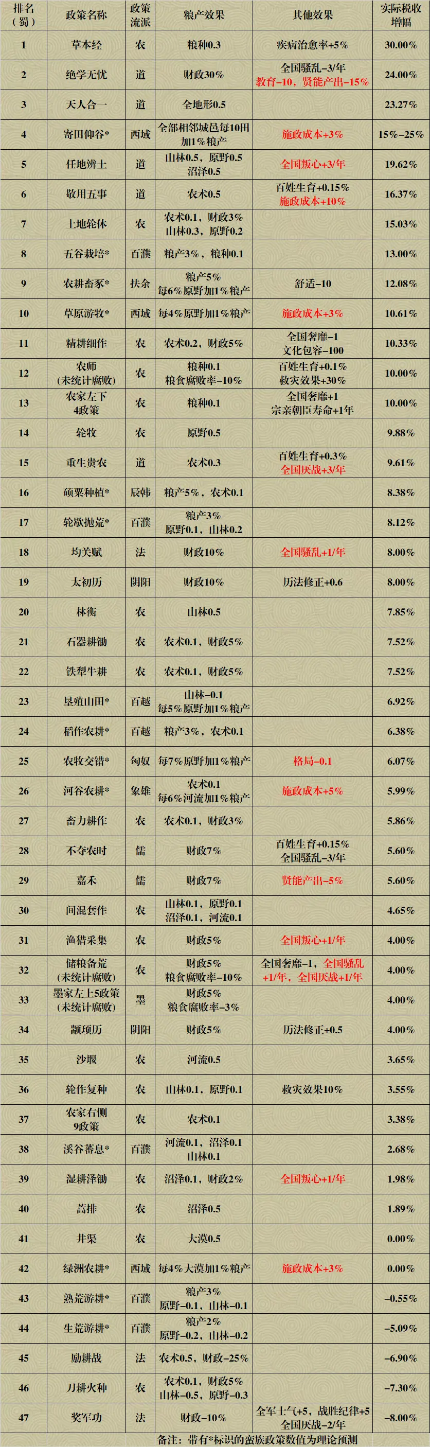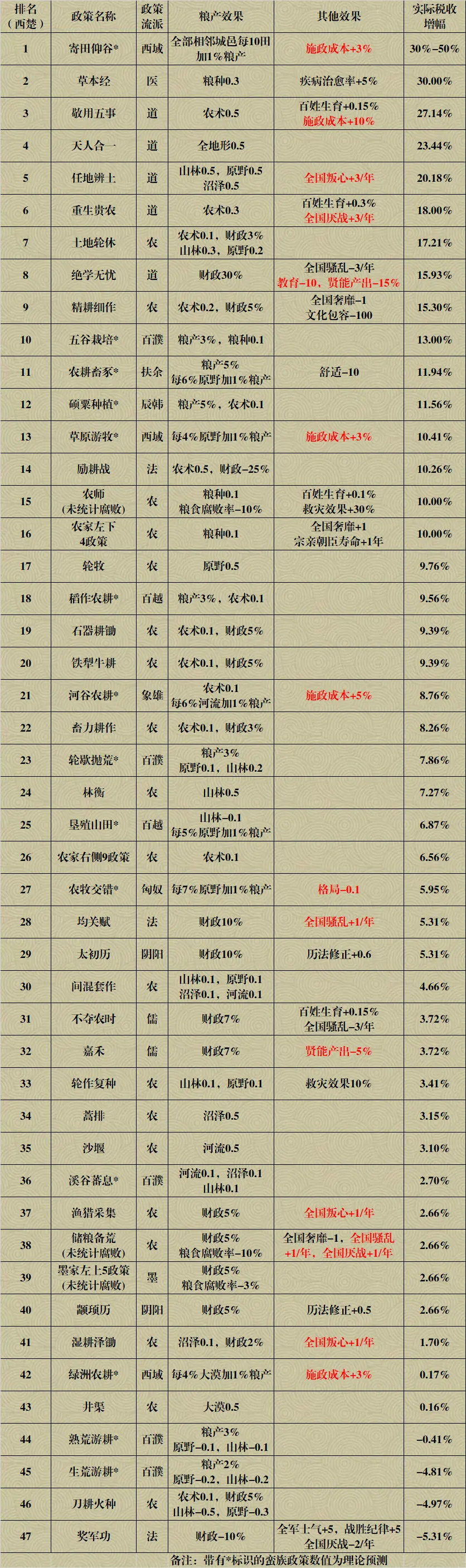 下面的表格为两个国家主要粮产政策的实际税收增幅排名,测试方法同样为开局单政策实施。表中红色部分代表不能完全忽略的政策附带负面效果。