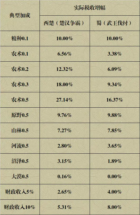 上表为典型加成的直接效果对比。就常见的0.1粮种、0.1农术、0.5单地形和5%财政收入而言,粮种优势明显且非常稳定。地形不同种类差异较大,原野和山林显著高于其他地形,也高于0.1农术和5%财政收入。农术是唯一的非线性加成,人口越接近所需农人数量,其加成效果越好。考虑到农术的种田效率和技术水平加成,大部分情况下倾向性高于同等级财政收入。