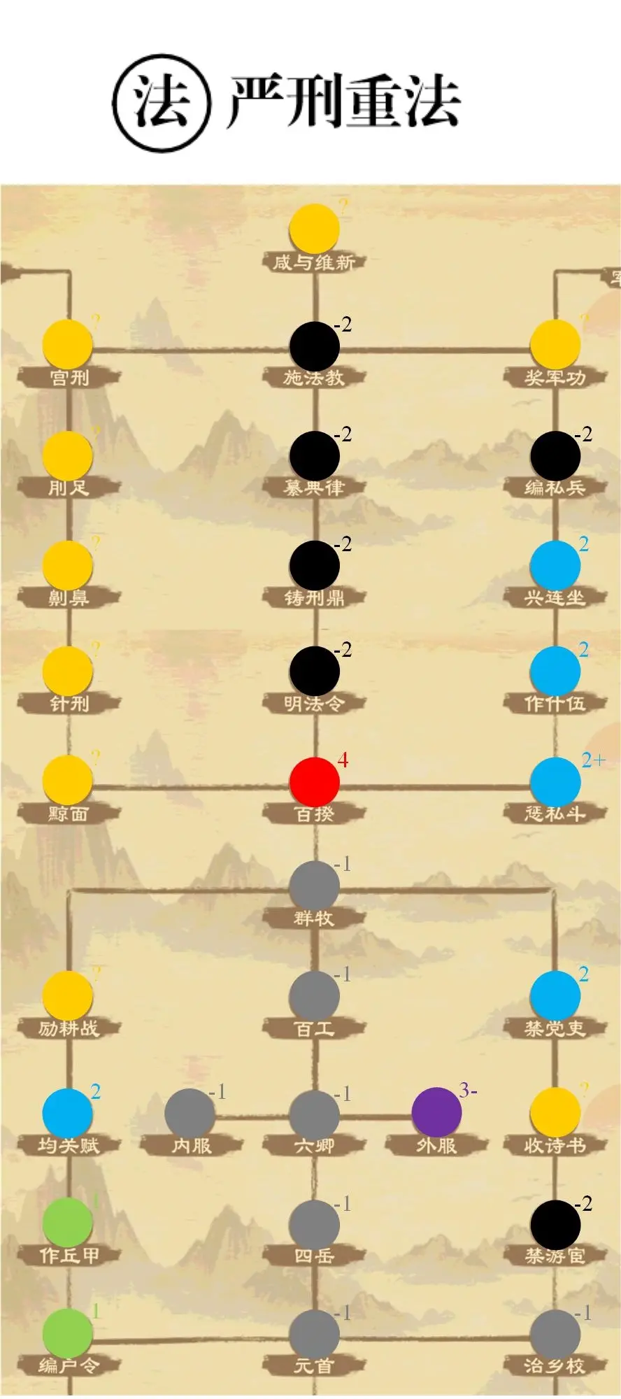 法家主修革新,主要是施政相关政策。基本没什么正常政策,神政策、神坑政策和争议政策的汇总。作为本人最爱用的流派,特别提醒一下法家流派学的是百家政策,带上商鞅把几个核心政策点了就好,千万不要顺着点法家政策。