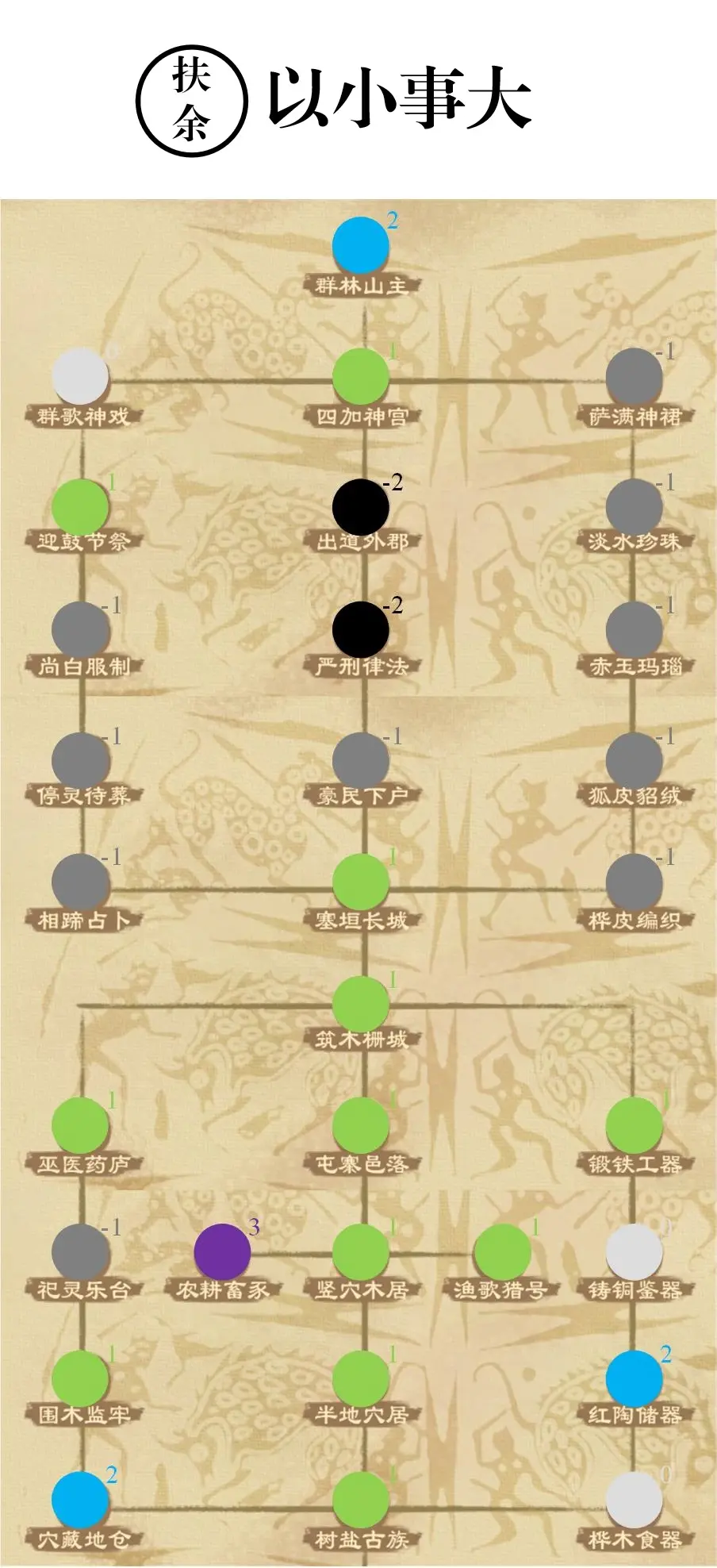 由于国家越大实施政策成本越高,一般来说开局可战的大国重点关注粮产和军事扩张相关的强力政策。中等国家开局优先点3级或以上政策,贤能允许条件下适度兼顾2级政策。小国开局(特别是1城“家国一体”buff)1级或以上都可以低成本刷。