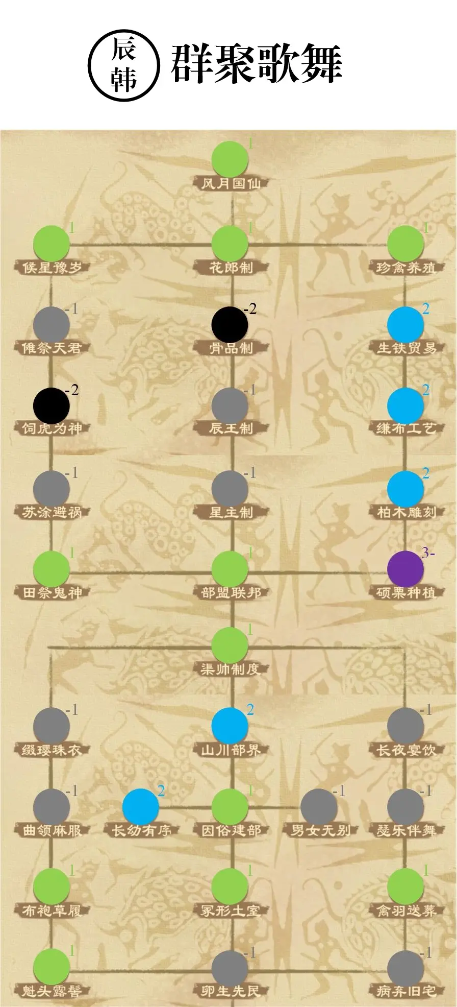 和中夏政策组任意流派均能够实施全部九个流派政策不同,蛮族政策组在实施其他流派政策方面具有较大限制,即只能实施本流派和相邻流派政策。流派的具体相邻关系如图所示,与历史上各流派的地理相邻关系一致。这里唯一特殊的是辰韩,只能实施本流派和扶余的政策(辰韩:制作组一定是对我有看法),不知道是不是bug。