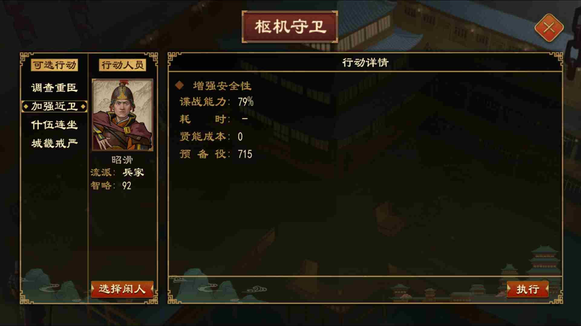 枢机守卫操作路径:【禁府-枢机守卫-调查重臣、加强近卫、什伍连坐、城畿戒严】