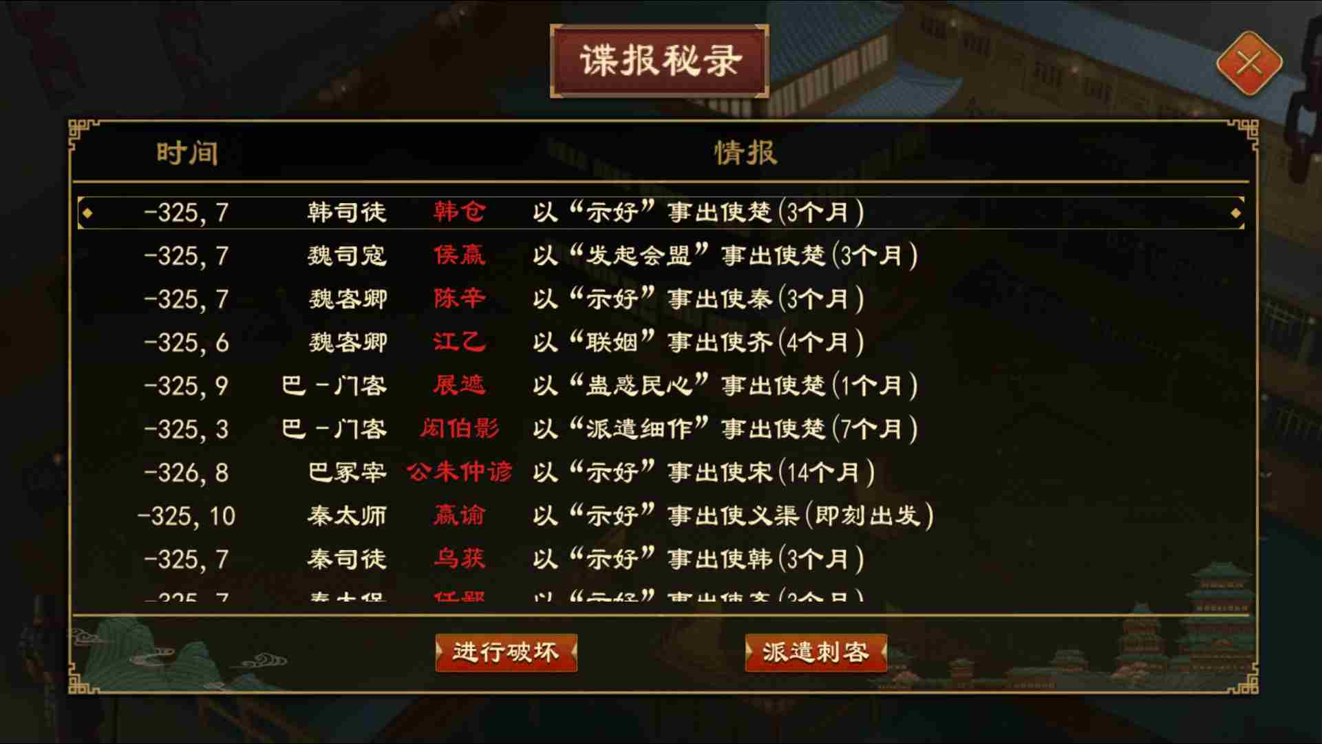 发展情报网操作路径:【禁府-谍者名册-派遣】【他国界面-谍战外交-用间】