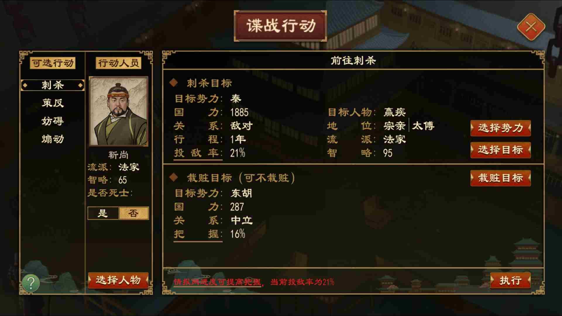 刺杀可选择对方国家的国君、朝臣、宗亲、储君之一;【栽赃他人】成功率由刺客、被陷害方司寇的谍战能力决定