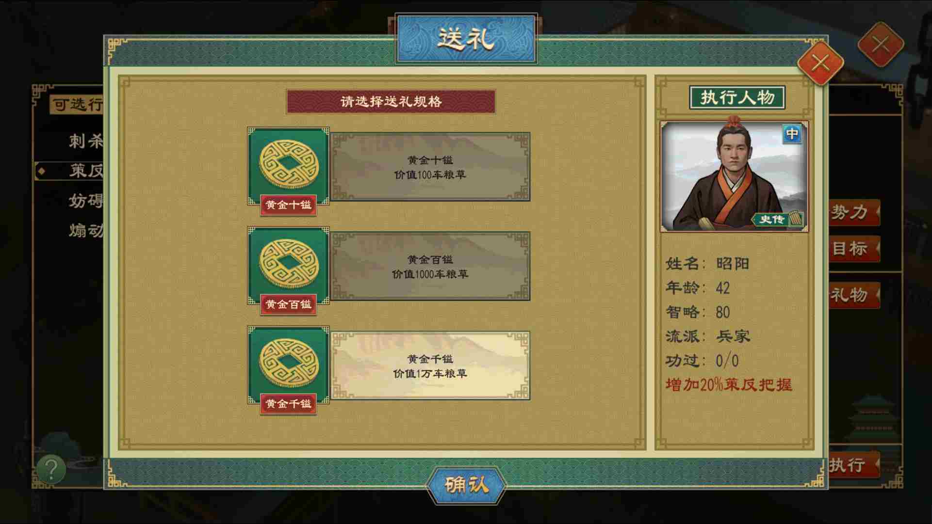 策反可选择对方国家的朝臣、宗亲、储君之一;【送礼】可增加策反成功率