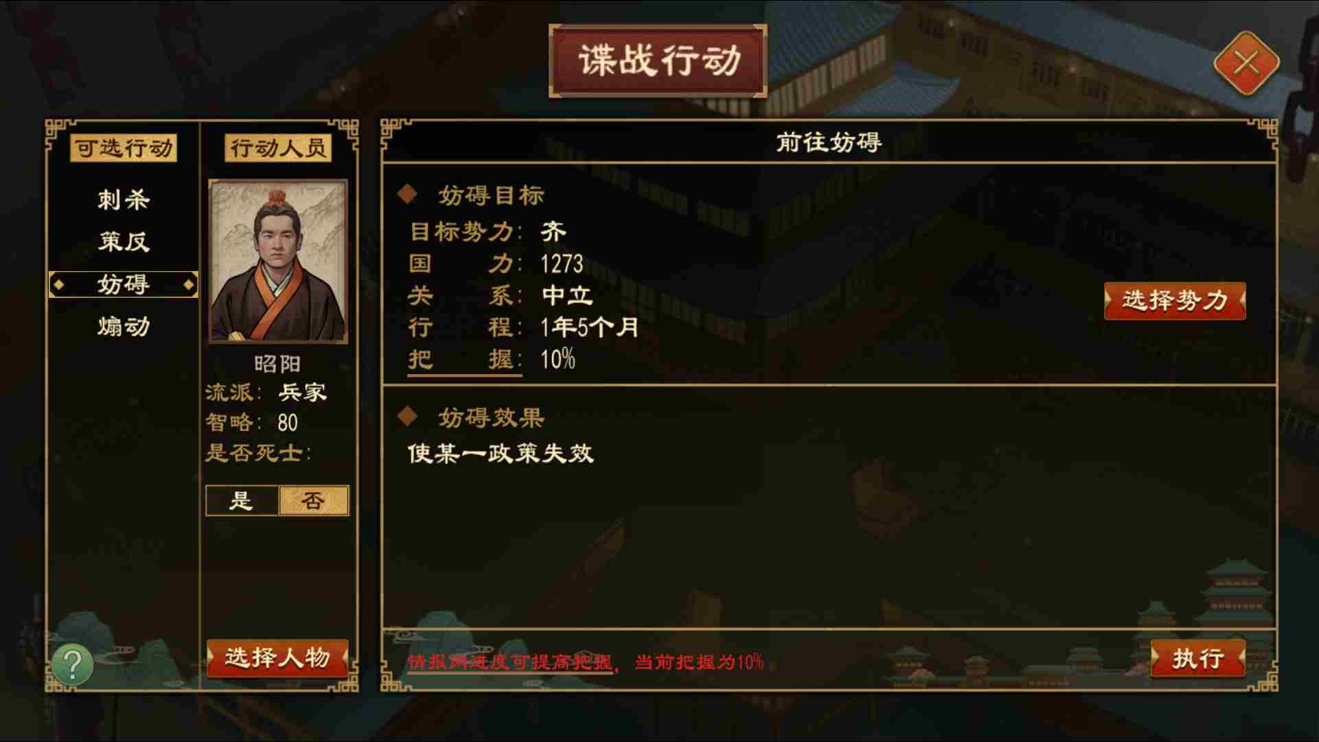 操作路径:【禁府-谍战行动-妨碍】/【他国界面-谍战外交-妨碍】