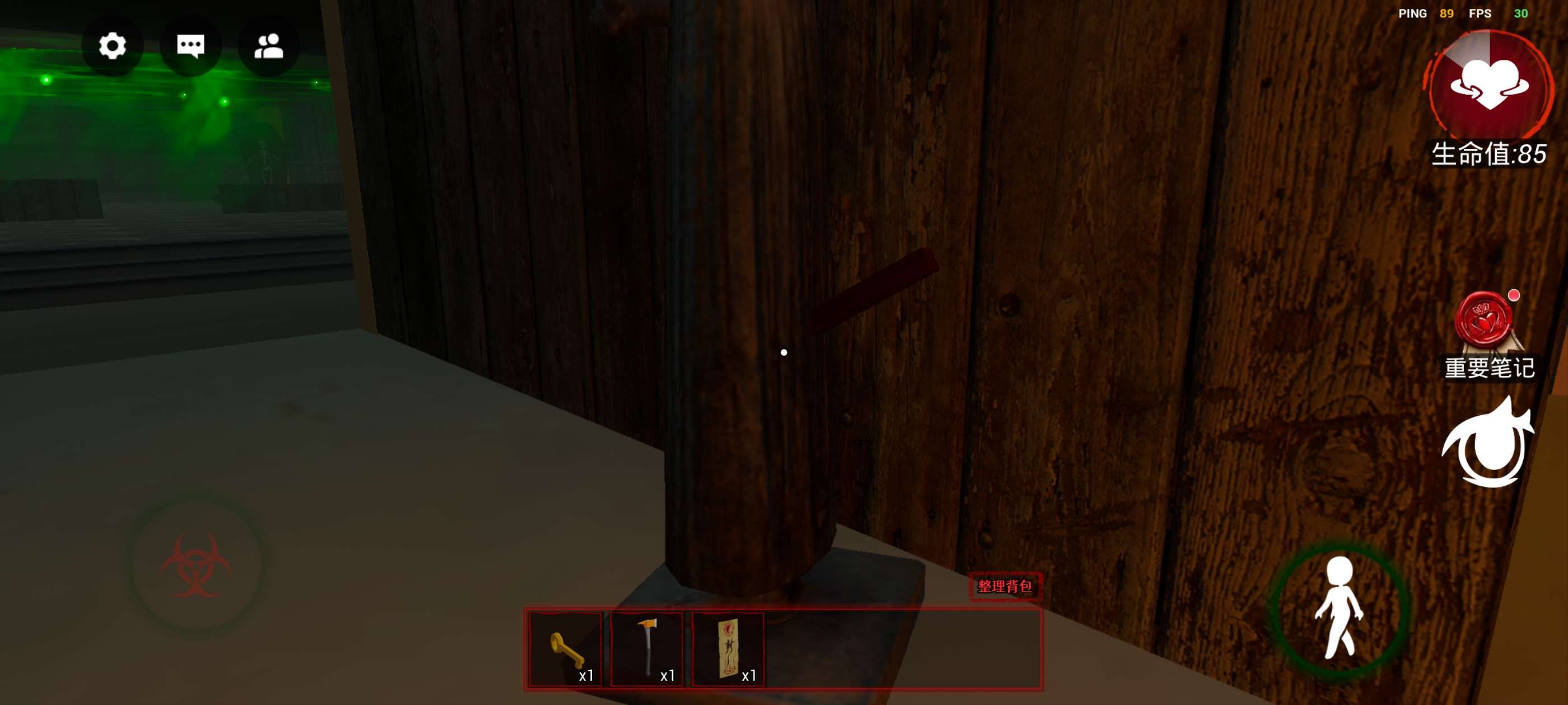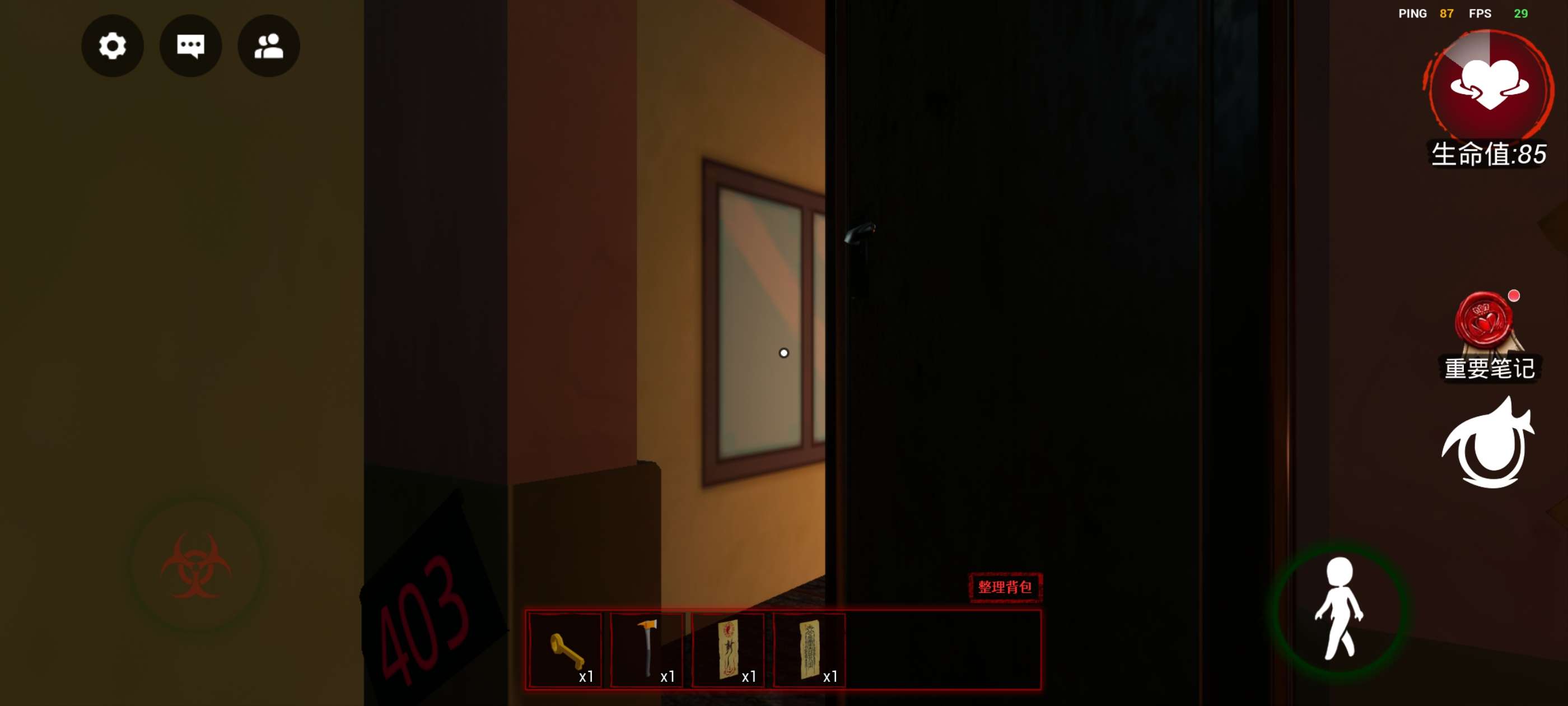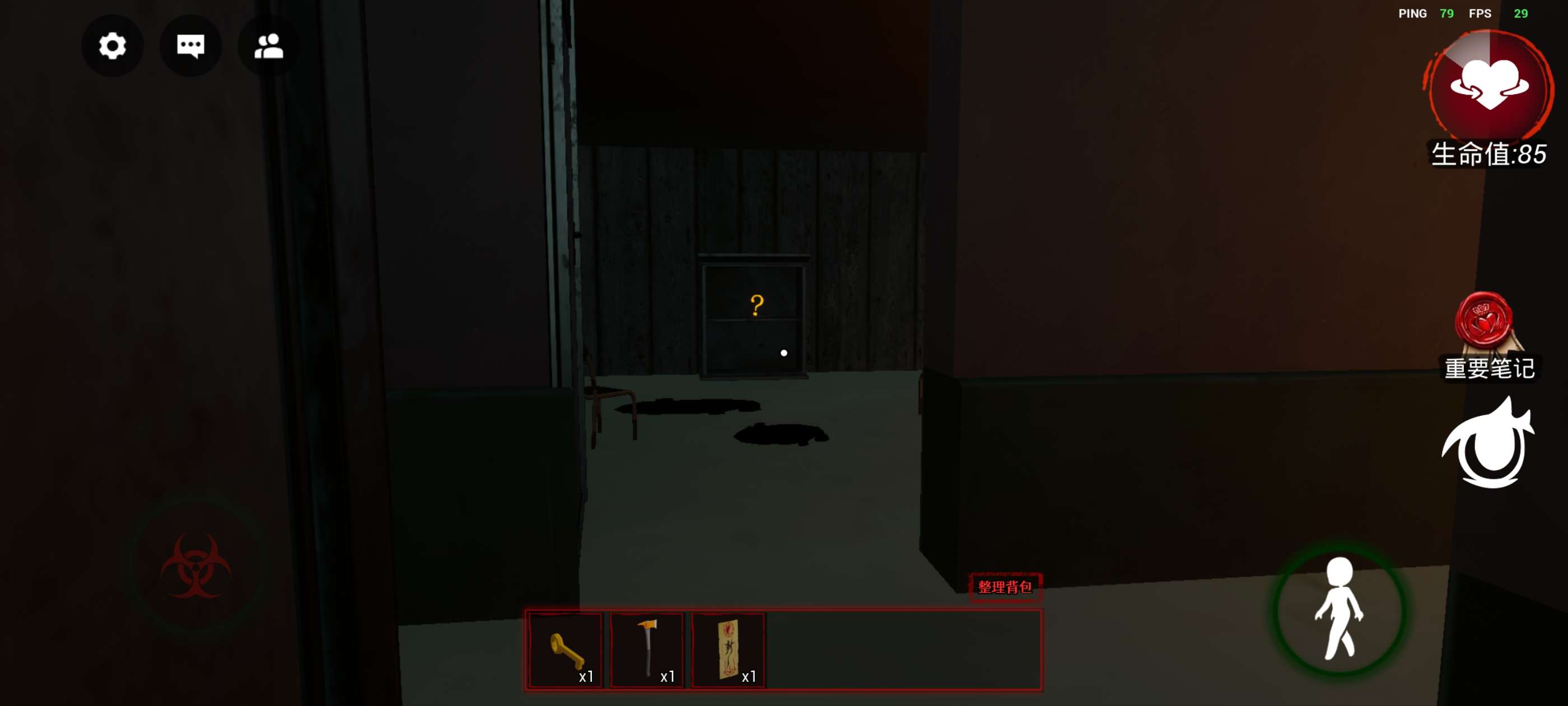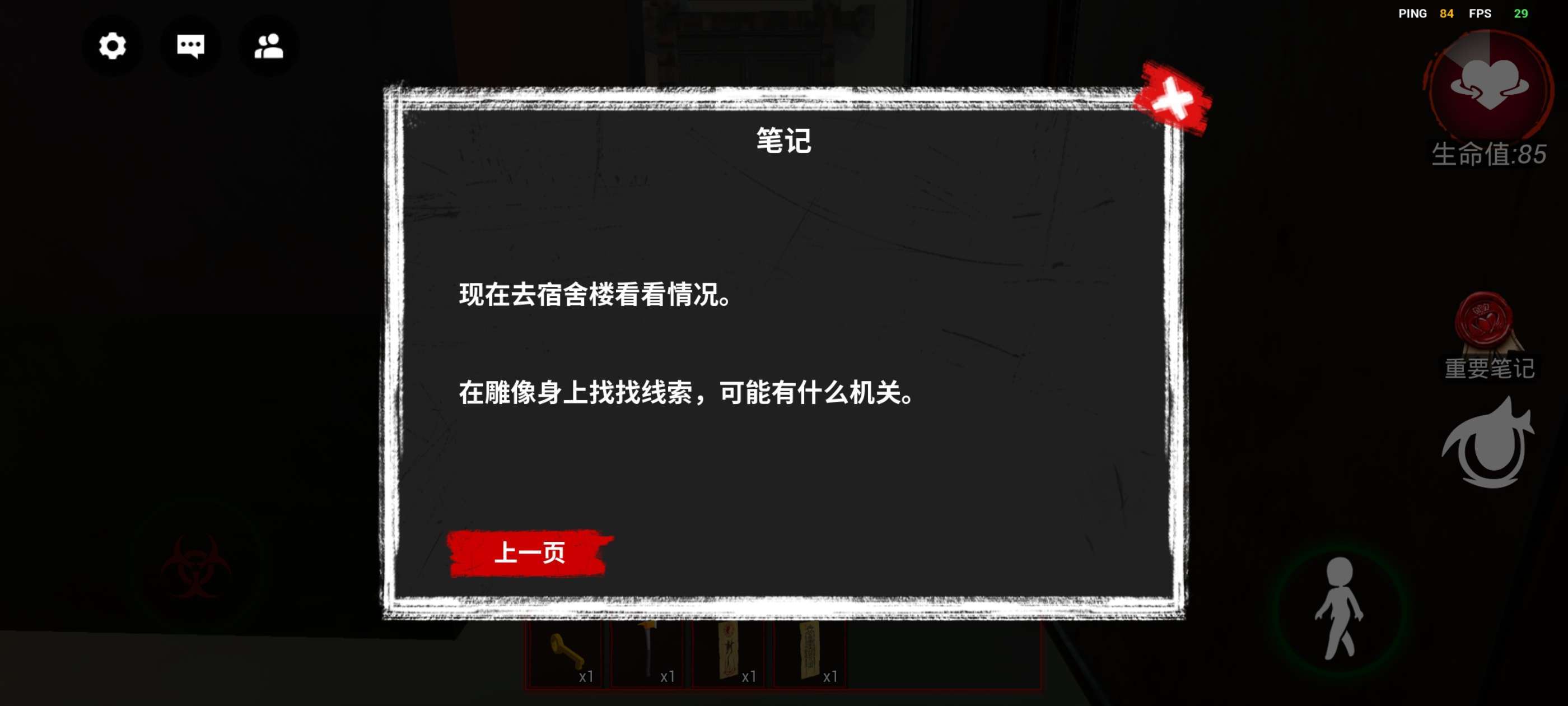 左下方控制人物移动,右上方生命值,如果为0则迷失,下方的《重要笔记》非常重要,很多时候会提供重要线索!再下方的眼睛按钮可以调节视角,推荐第一人称!!!