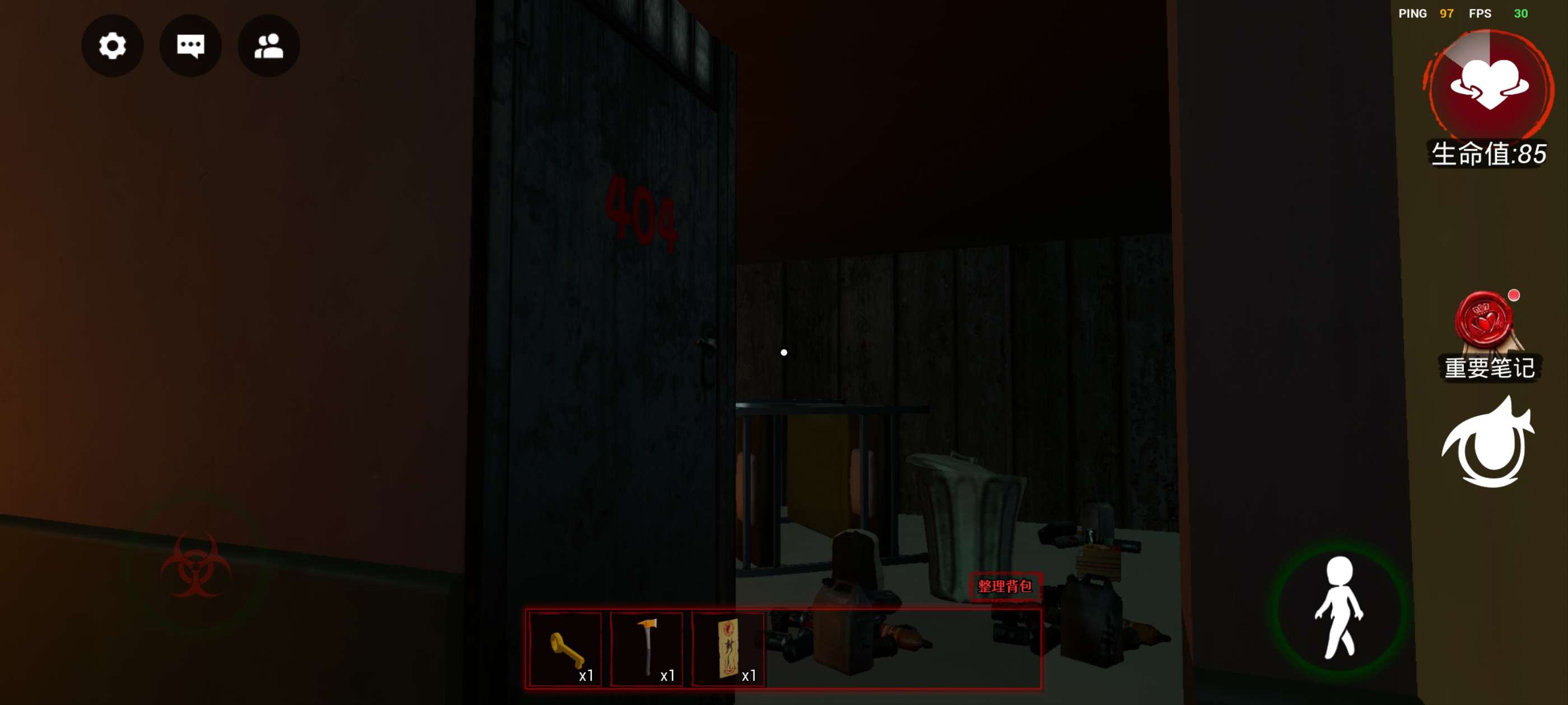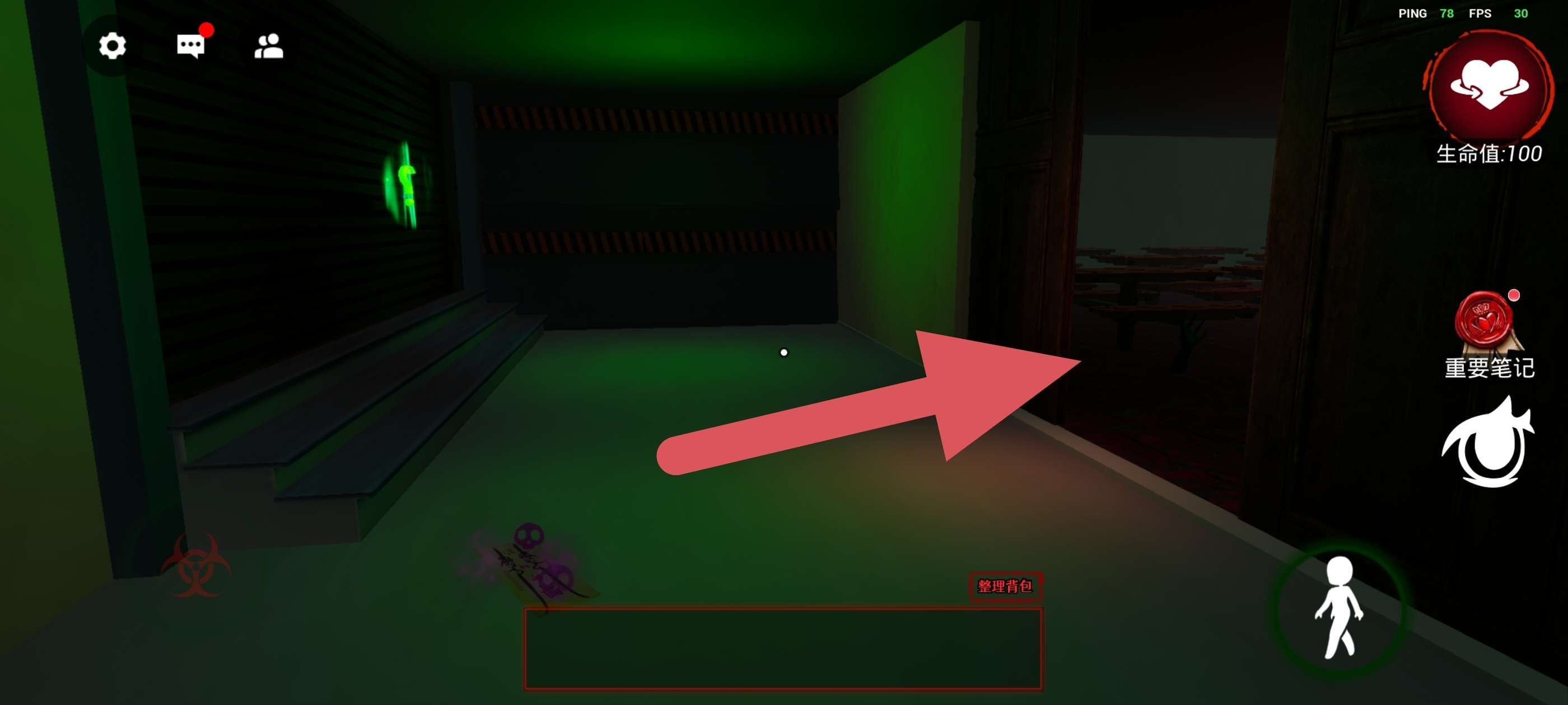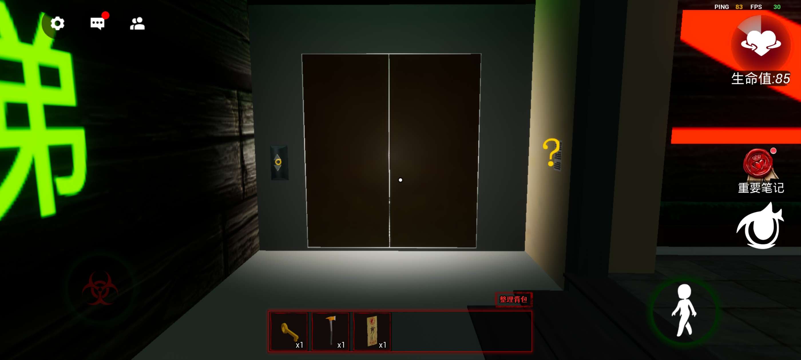 左下方控制人物移动,右上方生命值,如果为0则迷失,下方的《重要笔记》非常重要,很多时候会提供重要线索!再下方的眼睛按钮可以调节视角,推荐第一人称!!!